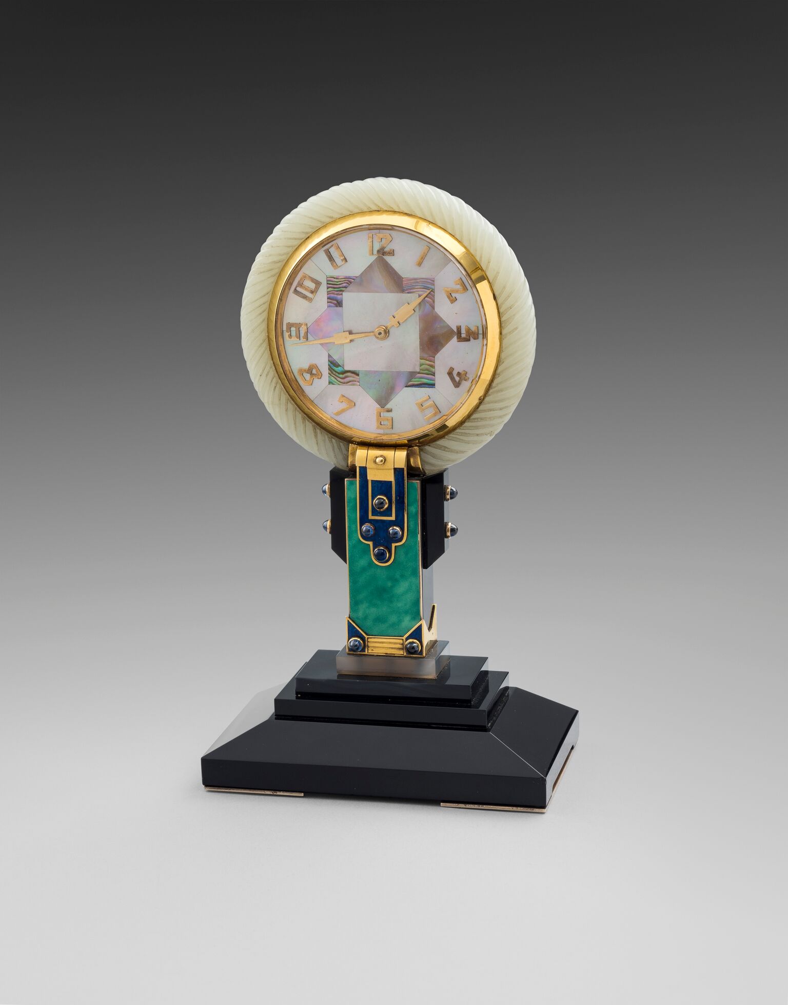 This week’s Director’s Choice focuses on an object of vertu so perfect and jewel-like, the epitome of all that was so wonderful about the Art Deco period. An elegant combination of geometric angular shapes, combining carved jade with gold and perfectly selected striated mother-of-pearl to form an octogram on the face of the clock resting on the stem inlaid with lapis lazuli, malachite, onyx and cabochon sapphires. The stepped onyx base has further gold feet. The gold mount is signed Lacloche Frères, and the gold touch marks are those of Verger Frères.