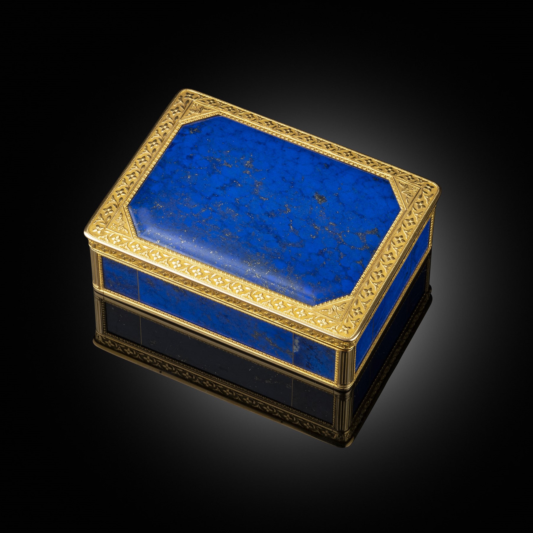 In this week’s Director’s Choice, I wanted to highlight one of greatest of the Parisian goldsmiths of the 18th and 19th century. His work is incredibly varied and always jewel like in its quality and execution. We are fortunate enough to have two of his outstanding boxes which will be showing at the forthcoming LAPADA Fair next week in Berkeley Square. The first of these, illustrated above, has the most exquisite lapis lazuli panels mounted in gold borders of flowing foliate tendrils interspersed with quatrefoil flowers. The Corinthian pillars to the sides of the box help frame the lapis which is perfectly partitioned by gold wire and held in place with a dart decorated border.