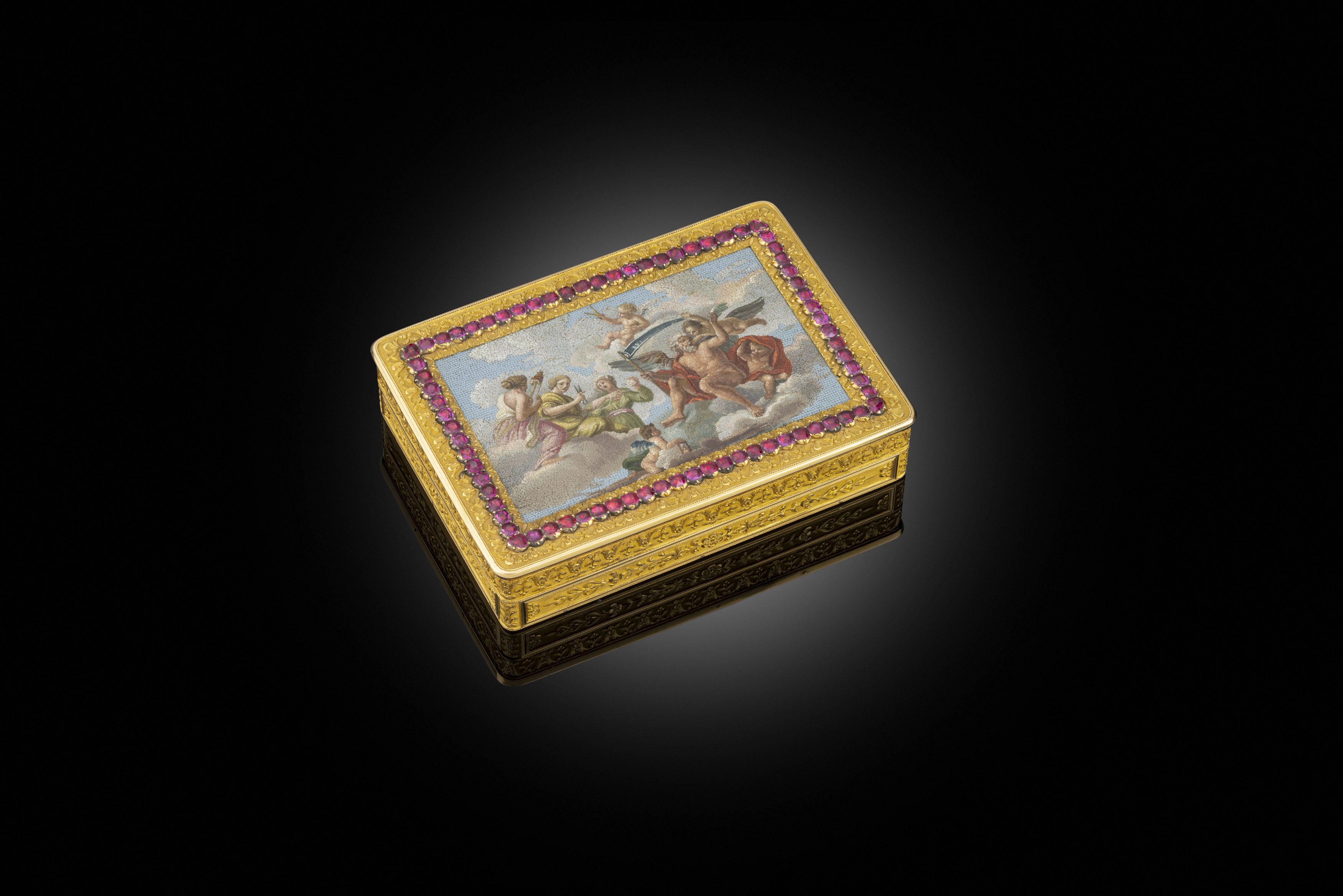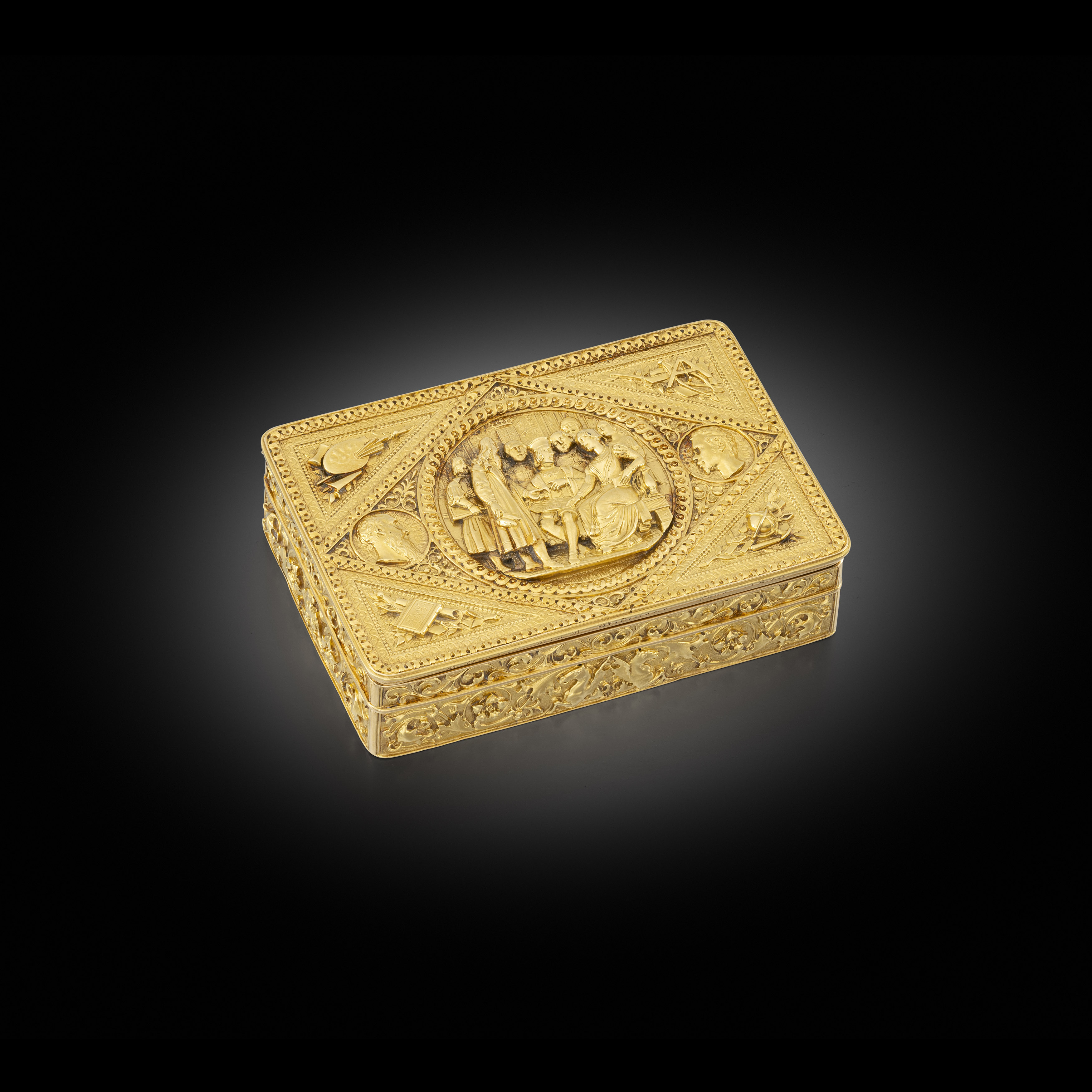 It is generally believed that the first evidence of the sniffing of a powdered tobacco was recorded by the Franciscan monk, Ramon Pane, in 1497. Although the most popular form of inhaling tobacco right up until the late 17th century was of course through smoking. By the beginning of the 18th century the fashion for taking snuff had become widespread. Gold boxes have always played a long and important role in fashion, self-promotion, diplomacy and in collecting. Often, they were used as a currency for their monetary value and the status they could embody. Their practical purpose was usually secondary, and they have always been a source of fascination. This Italian eighteen carat gold table snuff box is of such exceptional proportions and its creator the goldsmith Bellezza has spared no expense in the making of his masterpiece. It is lavishly decorated and finished with such jewel like quality that it is my Director’s Choice. We are proud to present this unique triumph of the goldsmith.It is generally believed that the first evidence of the sniffing of a powdered tobacco was recorded by the Franciscan monk, Ramon Pane, in 1497. Although the most popular form of inhaling tobacco right up until the late 17th century was of course through smoking. By the beginning of the 18th century the fashion for taking snuff had become widespread. Gold boxes have always played a long and important role in fashion, self-promotion, diplomacy and in collecting. Often, they were used as a currency for their monetary value and the status they could embody. Their practical purpose was usually secondary, and they have always been a source of fascination. This Italian eighteen carat gold table snuff box is of such exceptional proportions and its creator the goldsmith Bellezza has spared no expense in the making of his masterpiece. It is lavishly decorated and finished with such jewel like quality that it is my Director’s Choice. We are proud to present this unique triumph of the goldsmith.