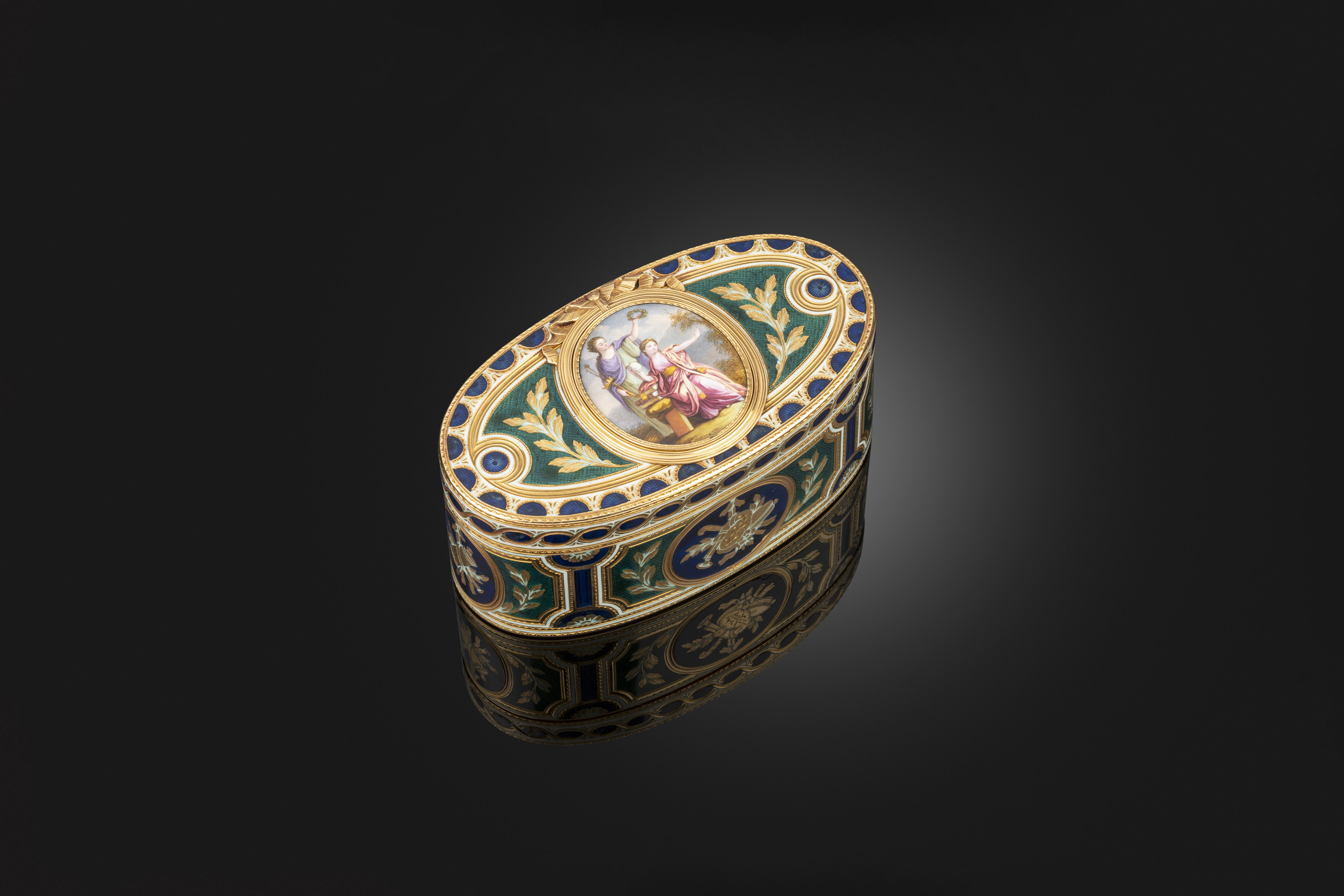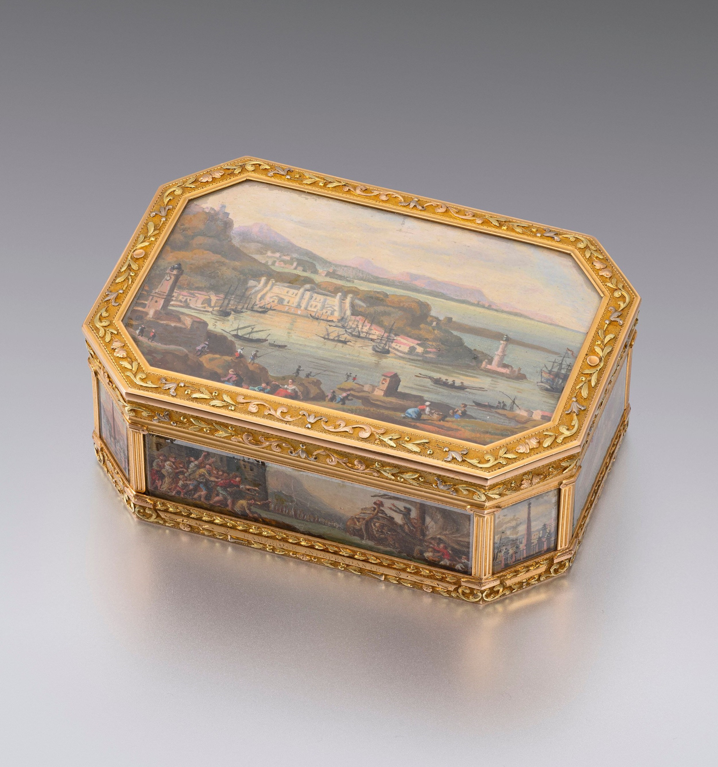 This splenid gold box commemorates the recognition of the independence of the United States of America by the King of France Louis XVI Of rectangular cut corners shape in four colour gold with glass panels containing miniature watercolour views, of which one is signed J F Genillion for Jean Baptiste François Genillion (1750- 1829). The borders in vari-colour gold decorated with foliage and framed by ionic columns. The gold lined interior with the inscription: “Inscription sul l’Obelisque. Du règne de Louis XVI. Ce port sera à jamais un monument de sa bienfaisance, un refuge a toutes les nations, un asile à la marine militaire et un motif de reconnaissance envers un monarque qui ne règne que par ses bienfaits. MDCCLXXX” (In the reign of Louis XVI. This port will always be a monument of his benevolence, a refuge for all the nations, a shelter to the military navy and a reason of gratitude towards a monarch who reigned for nothing but his good actions. 1780). Paris, 1789 Maker’s Mark of Jacques Felix Vienot Width: 8.3 cm, 3.26 in Height: 3.2 cm, 1.25 in This historical and important gold box marks a very significant episode of political history. In the year 1780 an obelisk was erected in the main square of the town of Port Vendres, in the French region of the Eastern Pyrenees. The monument paid homage to the benevolence of the King Louis XVI for recognising the Independence of the United States of America in the 1780 Treaty of Versailles. Obélisque élevé à la gloire de Louis XV sur la place du Port Vendres, Charles de Wailly. Musée du Louvre, Paris. The town of Port Vendres was chosen to host the monument for being the conventional point zero in geographical measuring in the French system, from which elevations are evaluated, allowing metric measuring of the altitude of all other countries. The town gained importance in the XVIII Century, due to its strategic position being the last French port before the border with Catalonia, and it was chosen as the one of the major ports for commerce with the United States. In the 1770's, Comte de Mailly, Lieutenant General of the province of Roussillon, was in contact with Benjamin Franklin (see extract from letter below) and was involved in France’s support for the thirteen states in their fight for independence from Britain. He also wanted to make Port Vendres a modern site and the royal architect, Charles de Wailly, was asked to design the prospect of the heart of the town: the port and the main square centred by the Obelisk in a modern Neoclassical style. The Obelisk, which is illustrated on the base of this box, is still standing in the central square and it is in marble, crowned by a globe surmounted by a fleur-de-lys. It rests on four turtles that refer to the four continents as the four classical trophies at each corner also do. The four frontal sides of this box show the contents of the four panels designed by Charles de Wailly that appeared around the base of the obelisk and they each bear an inscription with a description of the scenes. “L’Amérique indépendante” shows the Royal frigate ship of King Louis XVI, la Sensible, entering the port of Falmouth, Massachusetts, in 1778 to support the treaty of allegiance and friendship of commerce signed with the newly born American State. On the stern of the boat is a Phrygian cap, symbol of both the French and the American revolution. It is of particular significance the fact that this decoration was chosen to appear on the frontal side of the base, the side facing the entrance of the port, greeting the incoming boats with such a powerful message of democracy, modernity and hospitality. The left side displays “La Marine Relevée”, celebrating the port of Toulon, the northern principal base of the French navy, and the port of Brest, the southern and second most important port, meeting between “The Two Seas”, the Mediterranean Sea and the Atlantic Ocean thanks to the Canal du Midi, while a personification of Glory presides. The third side displays “La Servitude Abolie”, showing the King exiting the Palace to proclaim the freedom of the “Servants of the State” directly to his grateful people. “La Liberté du Commerce” concludes the narrative, with the personification of France and that of Freedom announcing to all nations the freedom of trade under the protection of the King. These four bronze plaques, that used to adorn the base of the monument, have been removed in 1793, together with four naval ornaments, but were preserved, restored and applied again in 1989. The richly symbolic images on the panels are also documented in a lithograph currently in the City Library of Toulouse, and in a series of drawings, currently in the Metropolitan Museum of New York, proving the popularity and importance of the theme. Bas-reliefs de l'obélisque de Port Vendres, part of the Fonds Ancely of the City library of Toulouse. The painter Jean Baptiste François Genillion, who painted the watercolours on the box, was known in his days for his realistic representations of marine subject and harbours’ views, and his hand is recognizable in the two views of Port Vendres that he adds to the top and the bottom of this box. The top shows the view of the bay, the inhabitants of the town immersed in their calm and diligent daily activities. The bottom shows the Obelisk standing proud against the dramatic scenario of the Pyrenees mountains. The four cut corners are also decorated with incredibly detailed views of the monument seen from the four different sides. The recognition of the Independence of the United States of America operated by the French King Louis XVI is an act of extraordinary importance and of unprecedented modernity as the King was always a supporter of the American emancipation from the British Empire. He was enlightened by the progressive ideas of Benjamin Franklin who, in those years, was a commissioner for the United States at the French court actively preach