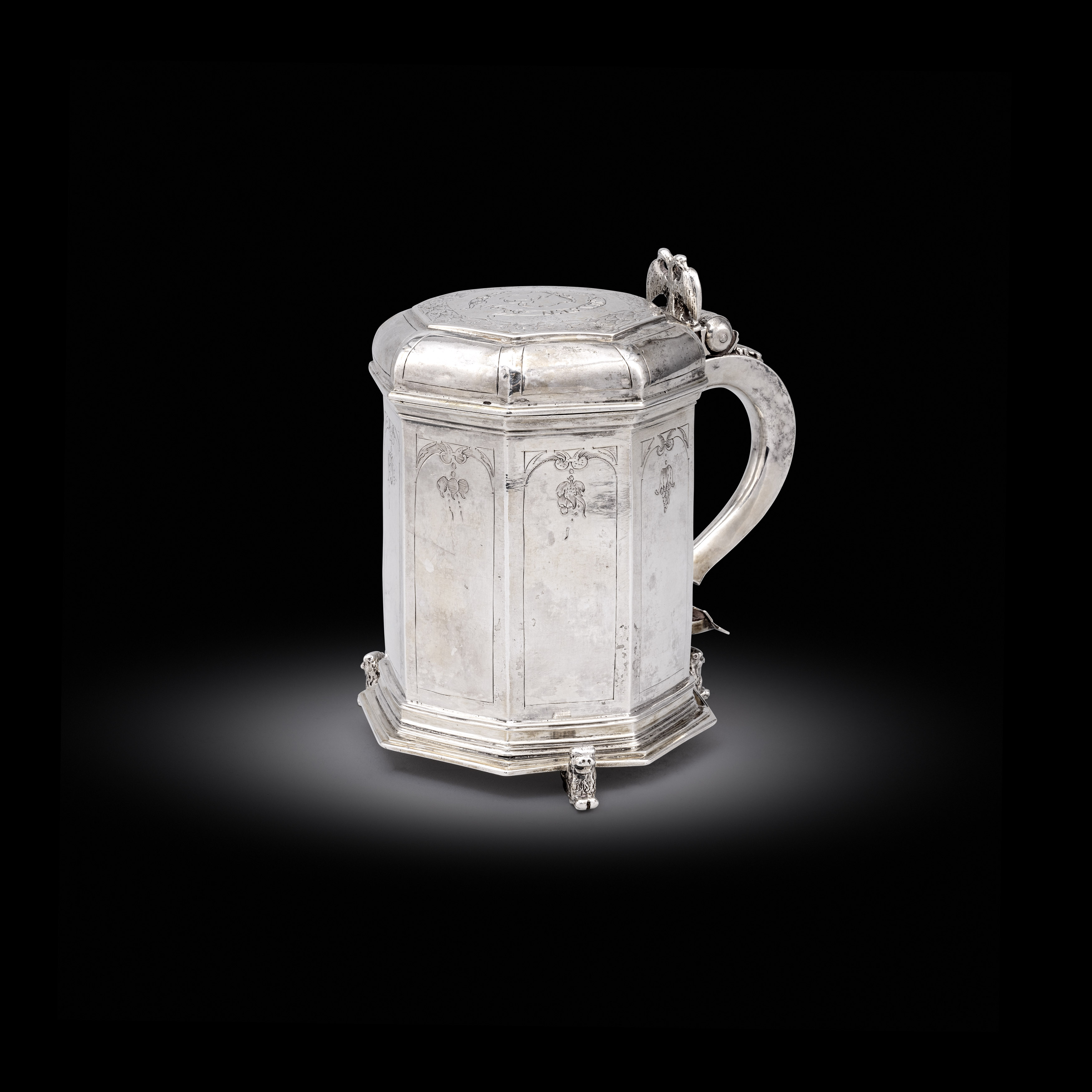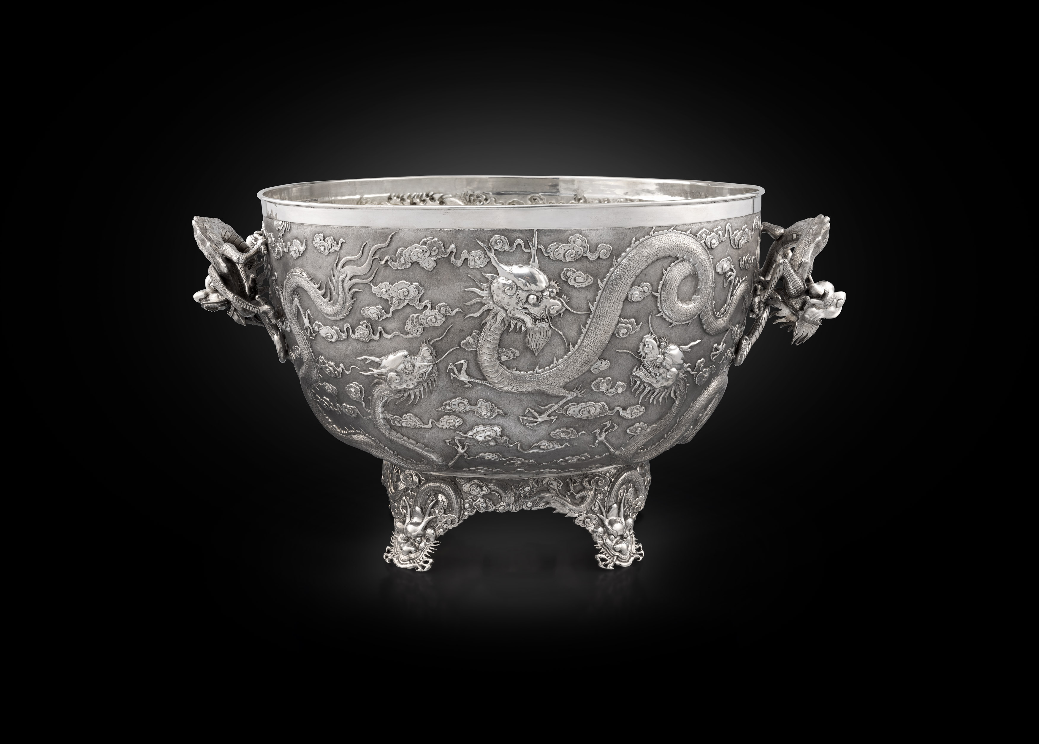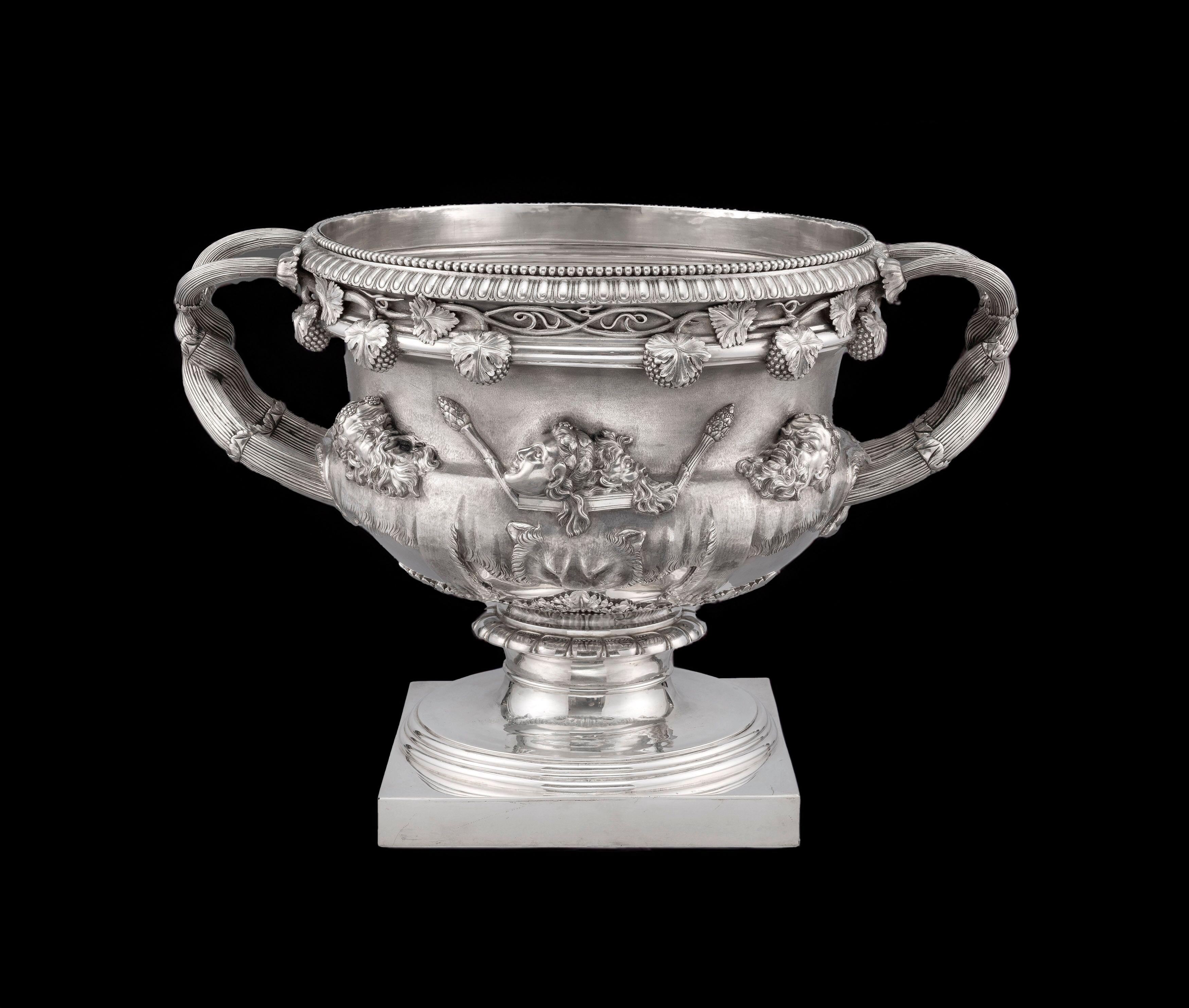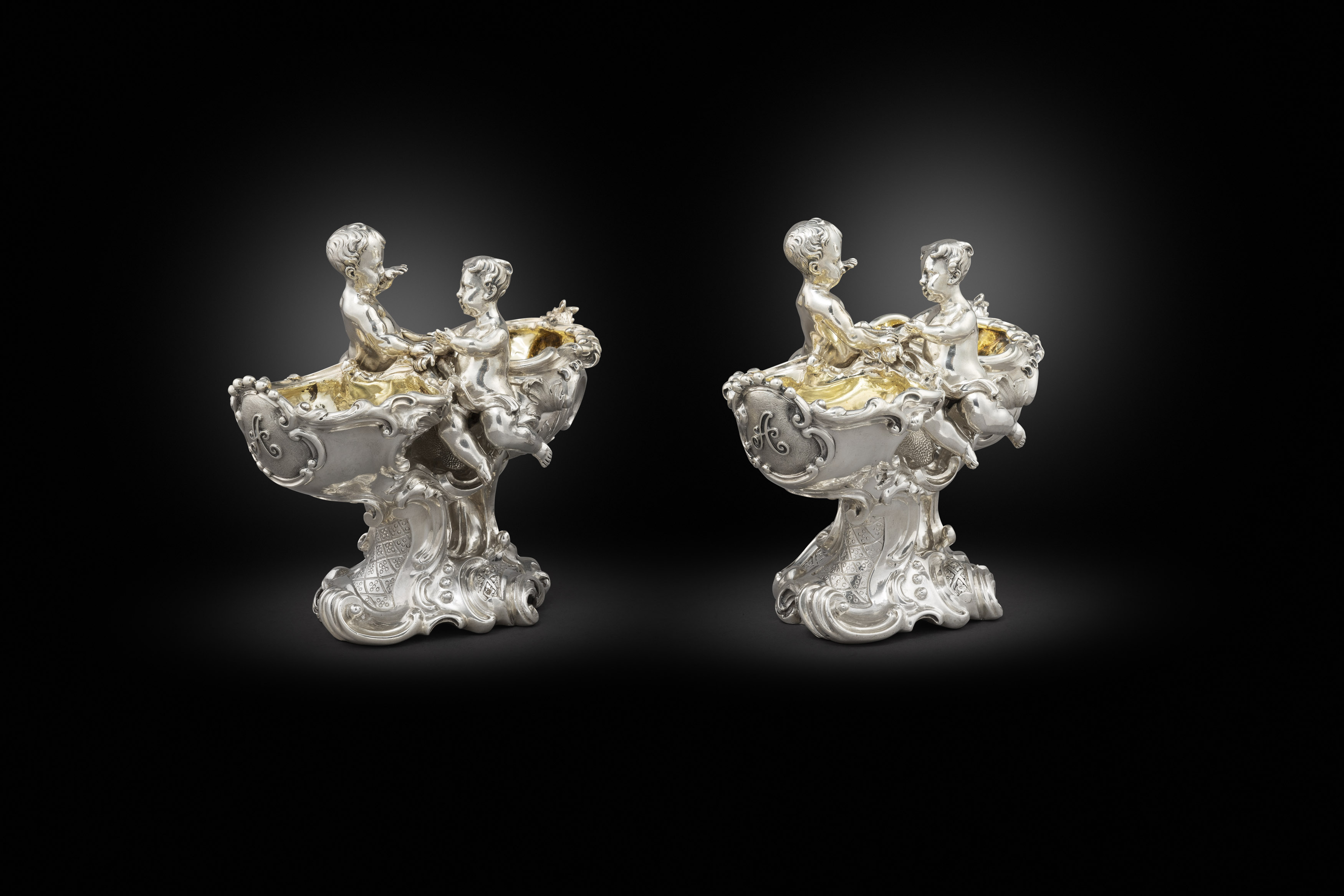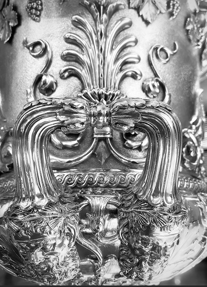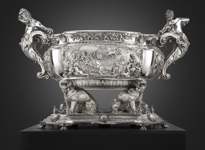 Koopman Rare Art proudly presents, the largest piece of Sterling silver commissioned since the creation of the Jerningham - Kandler cistern, London, 1734, residing in St Petersburg at the Hermintage Museum. This wine cistern is modelled after the George II example made in London, 1734 by Charles Kandler. Its inspiration can be traced to a sketch of the design honouring the wine god Bacchus, executed by the antiquarian and engraver George Vertue (1684-1756) - the wax models for the figures were executed by the Flemish-born English sculptor John Michael Rysbrack (1694–1770). The original cistern, now in the Hermitage Museum, St. Petersburg, was the work of the silversmith Charles Frederick Kandler (act. 1720–1770s). When this remarkable piece was finally ready in 1734, Meynell had changed his mind and Jernegan found himself stuck with the extravagant object for which he failed to find a buyer. Offered initially as first price in a lottery of 1739, the wine cistern subsequently entered the collection of Empress Anne of Russia the following year. The wine cooler of oval form, waisted below the rim, with large oval medallions. The bowl rests on four seated panthers, teeth bared, each with one paw on a bunch of grapes. The panthers each with collars and are tied to the bowl with chains. Heavy S-scroll handles with herms of a faun and a bacchante, both holding bunches of grapes with vines lain across their hips. The upper section of the scrolls has a profiled edge in comparison to the curves of lower - forming the base or stand of the herms – and are ornamented with acanthus leaves. Attached to the sides of the bowl are relief bacchic scenes with putti. To one side, putti surround a chariot pulled by panthers in which sit two more putti, one of them the young Bacchus, with a figure of Cupid hovering above; the other shows putti dancing, flanked by a group of putti fighting with others drinking and playing with a panther. All parts of the wine cooler were cast from moulds and then raised and chased, before being soldered together. Bolts fasten together the larger parts: the handles to the bowl, the bowl to the panthers, etc. The medallions are much thicker than the side walls of the bowl itself, as to accommodate decorated of very high relief.