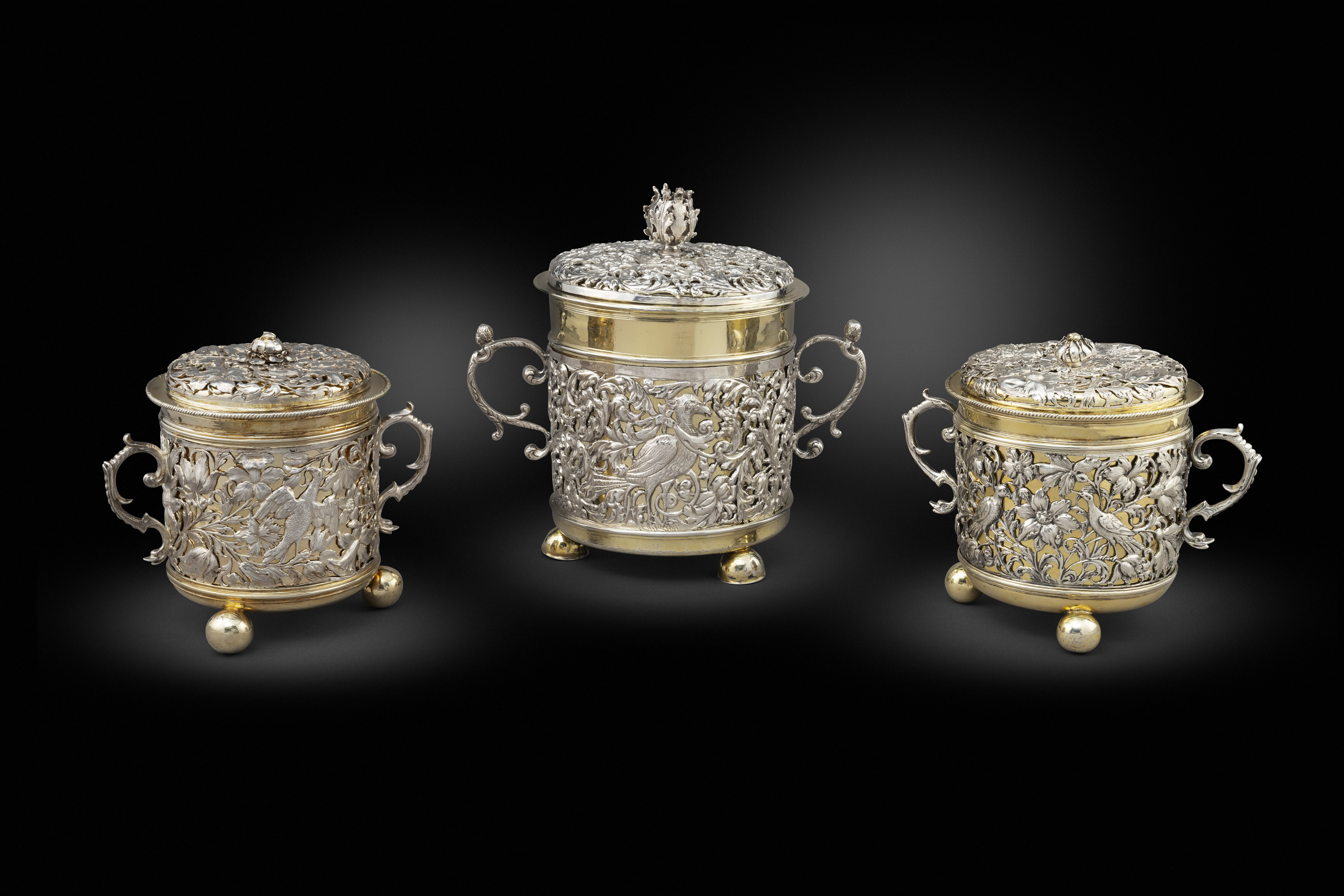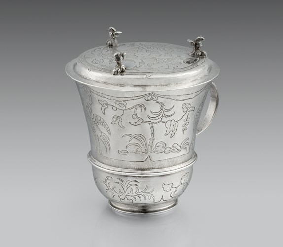 An Exciting Group of Three 17th Century Charles II Two-Handled Cage-Work Cups & Covers Circa 1670 This week’s Director’s Choice focuses on a curious group of 17th century Caroline cage-work sleeve cups that appear in England in the 1660’s. These cups are of an incredibly rare form and so few survive today. We are proud to be able to present three of these treasures, all different in their own way but with similarities that would point to the same goldsmith’s workshop. These beautiful cups have a more foreign Germanic feel about them entirely, but why should this be? One should consider that the skilled goldsmith was not the only influence behind this new design in 17th century England. The Royal court, power of the aristocracy, Parliament and gentry together with the economic growth through foreign trade and social changes, all had their part to play on the silver trade and consequently its design. It was these groups of landowners, together with the merchants and tradesman that made up most of the demanding clientele.