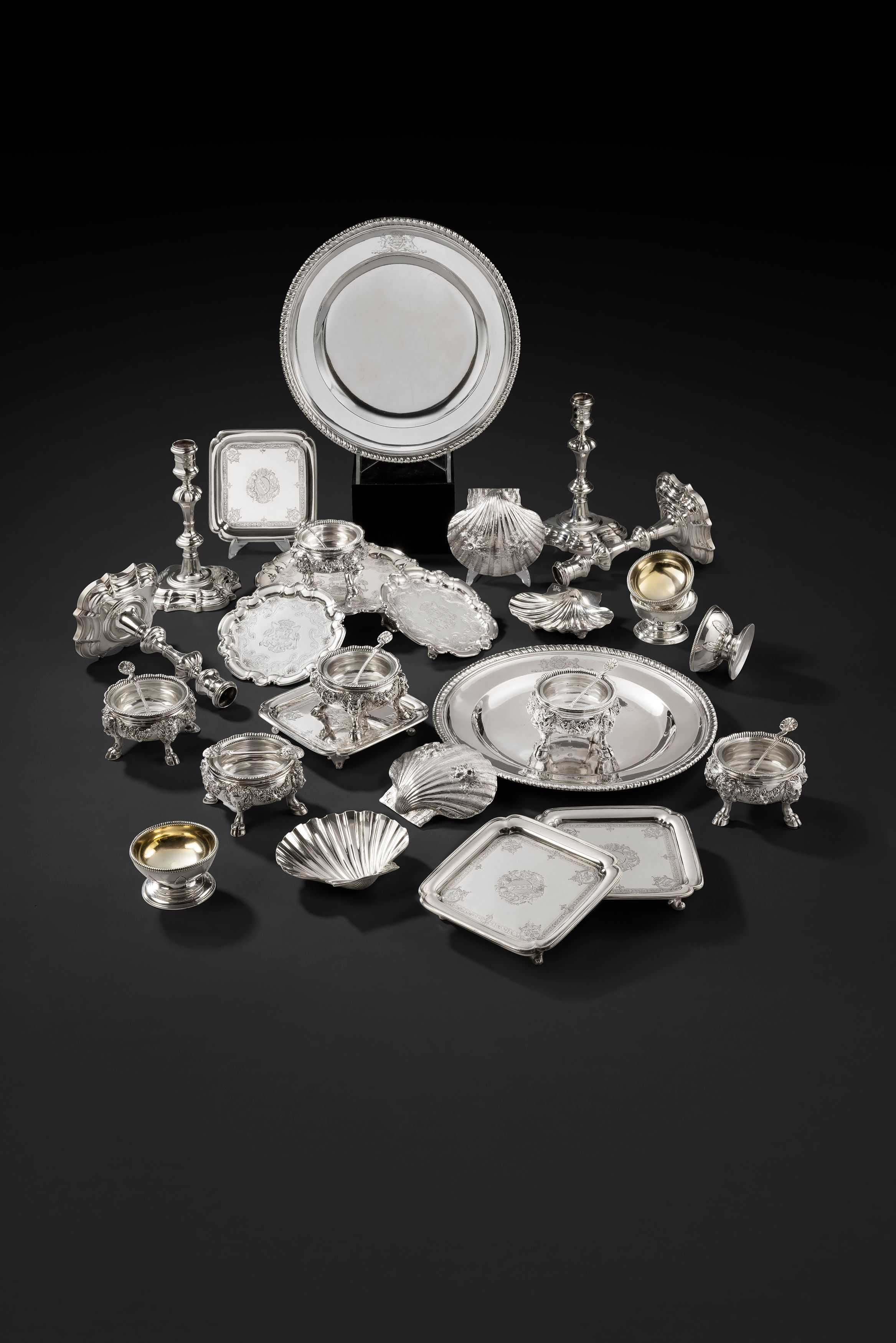 In celebration of The Queen's Platinum Jubilee, we have put together a collection of eight Royal pieces. These Royal pieces are from reigns past of varying lengths, but none with the longevity of the Queen's extraordinary seventy. King Charles II Reigned for twenty-five years from 1660 to 1685 Charles became King at the age of thirty. On the King’s return from hiding in Holland, he reinstated the splendour of the nation by adopting the elegant Dutch taste for chrysanthemums, tulips, and festoons of fruit in the ornamentation. The Dutch style is evident in the Royal wall sconces below. Each of the sconces presents a richly embossed background with lions and putti in relief and is partially applied with winged dragons emerging from masses of scrolling acanthus foliage. Adding to the rich decoration, each plain central panel is framed by palm leaf cartouches and applied above and below with the bust of Susanna, the Hebrew wife from the Book of Daniel. A Highly Important Set of Royal Four Single-Light Wall Sconces Made in England around 1670 Height: 39.2cm, 15 ½ in Weight: 6446g, 207oz. 6dwt Prior to Charles' coronation, Sir James Mercer was made his Gentleman usher. His only son, Charles, was christened in June 1667 in the presence of his godfather, the King, whose gift of 80 ounces of gilt plate to mark the event is recorded in the Jewel Office warrant books in the National Archives. Writing afterwards to his father-in-law, Mercer recalled that "His Majesty on occasion was very jovial, without any sort of drinking". The elegant ewer below was part of that royal gift. Silver historian Christopher Hartop has attributed the maker's mark on this ewer to Henry Welch, an immigrant craftsman who worked for the royal household. The mark appears also on a pair of candlesticks in Lambeth Palace Chapel and on another one in the Fogg Art Museum, Harvard University. The cut-card detail on this ewer is incredibly early and display a strong French influence. The Charles Mercer Ewer By Henry Welch Made in London around 1667 Height: 9 in (23 cm) Weight: 29 oz 5 dwt (914 g) Queen Anne Reigned for twelve years, from 1702 to 1714 Queen Anne was the first sovereign of Great Britain under the Acts of Union 1707, which united the crowns of England and Scotland into one country, creating the United Kingdom as we know it today. She was a great patron of the arts and was keenly interested in music, poetry, and theatre. She remodelled parts of the Royal Chapel and the Queen's Drawing Room of Hampton Court Palace in a grand baroque style. The campana shaped sconces surmounted with a crown by Anthony Nelme below were made for Queen Anne, but the cypher was changed in circa 1810 for Queen Charlotte. The openwork foliate scroll royal cypher now reads 'CR' - Charlotte Regina, Queen and wife of George III - finished with a scallop shell at the bottom. Anthony Nelme was one of the most prominent silversmiths working in the Queen Anne Style, recognised for the high quality of his technical skill and artistry of design. A Pair of Royal Wall Sconces By Anthony Nelme Made in London in 1713 Height: 52 cm, 20 ½ in. Weight: 2814 g, 90 oz 9 dwt. King George II Reigned for thirty-three years from 1727 to 1760 George II became King at the age of forty-four. During his reign, his popularity fluctuated. Interestingly, George II fought alongside his soldiers at the Battle of Dettingen in 1743 in Germany, which made him the last sovereign on the battlefield. George II gifted the presentation dish below to Sir William Strickland (circa 1686-1735), 4th Baronet of Boynton, co. York, on the occasion of his son, George's, christening in March 1729. The dish's centre is finely engraved with the Royal coat-of-arms of George II within a baroque cartouche flanked by supporters and above the motto DIEU ET MON DROIT. This would have been an ordinary gift from a monarch to a member of the Royal Household. Sir William Strickland succeeded to Baronet and, shortly after, became a Lord of the Treasury and Treasurer of the Queen's Household. A great friend of Sir Robert Walpole, Strickland, was chosen to replace Henry Pelham as Secretary at War in 1730 and was made a Privy Councillor, a position he held until his health forced him to retire in 1735. A Royal Presentation Charger Made in London in 1729 By John Edwards II Diameter: 50.5 cm, 19 7/8 in. Weight: 3,555 g, 114 oz. 6 dwt An Elegant Set of Three George II Casters Made in London in 1728 By Paul De Lamerie Weight: 854g, 30oz. Another extraordinary example of the George II style is embodied by these baluster-shaped Royal Casters, which feature the King's coat-of-arms. The casters present purity of form, exceptional gauge and quality, and intricate piercing, typical elements of the work of Paul de Lamerie. King George III Reigned for Sixty Years from 1760 to 1820 George III became King at the age of twenty-two. Historically, this King is known for many reasons, the most important of which – for us - is his role as patron of the arts. In 1768, George founded the Royal Academy of Arts and, in 1760, commissioned the Gold State Coach, which will most likely see throughout the Jubilee. The four Anthony Nelme Royal wall sconces you see above were first recorded in George III's silver inventory entitled 'A list of His Majesty's Plate in the Jewel Office, 18 February 1812’. Unfortunately, the sconces were among the considerable quantity of plate that the Prince Regent chose not to keep, so they were sold, ostensibly for melting, to Rundell, Bridge & Rundell. Like many other pieces in this group of the royal plate, however, Rundell disposed of them as part of their stock of second-hand and antique silver, a branch of their business which at that time was flourishing. Featuring the Coats of Arms of King George III is the 1817 Paul Storr seal box below. Seal boxes like the present one would have contained the wax seal to be affixed to royal documents. The two openings on each side would have presented a