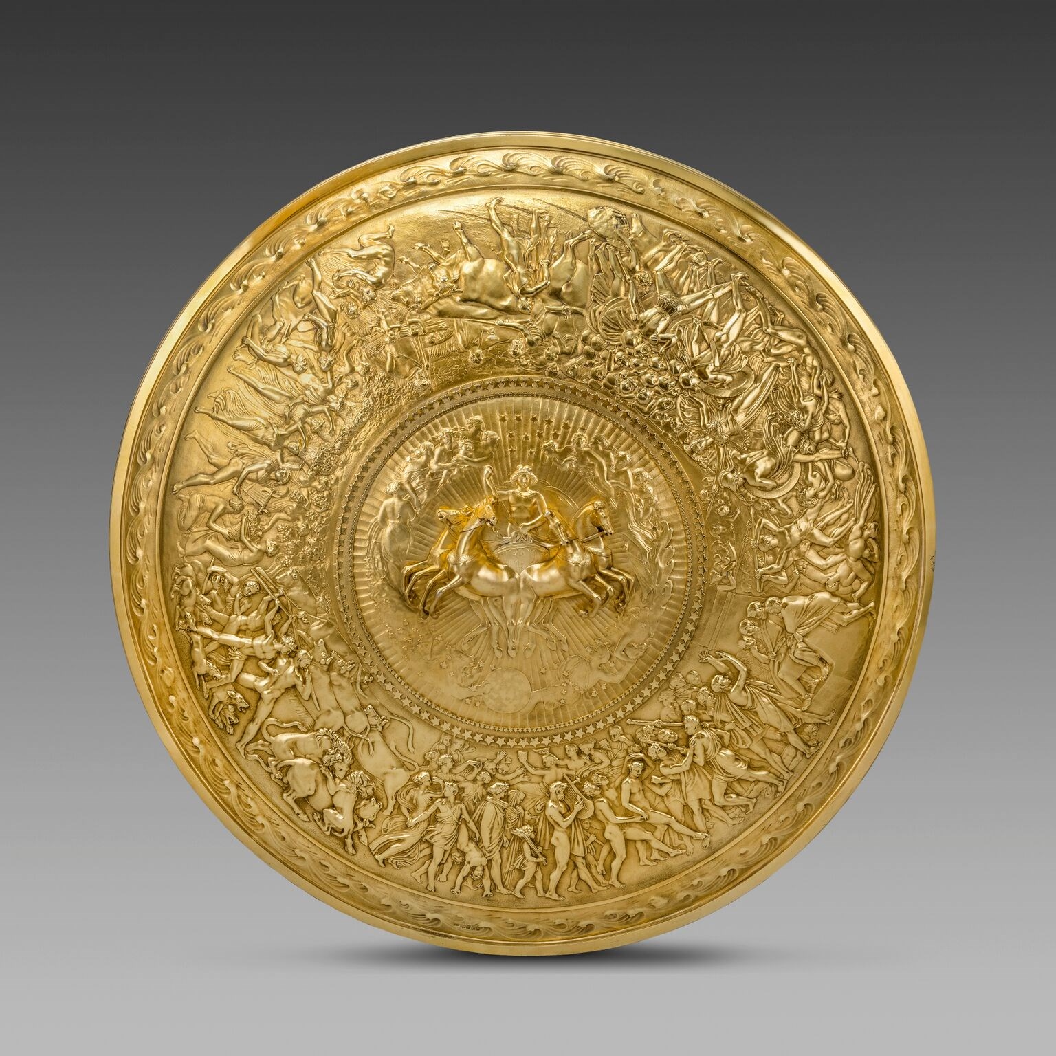 A Monumental Pair of George III Silver-Gilt Sideboard Dishes, 1813 We are extremely excited to announce the return of two highly important objects to Koopman Rare Art. A pair of George III Silver-Gilt sideboard dishes by Paul Storr for Rundell, Bridge & Rundell after the design by Thomas Stothard. This pair of sideboard dishes are historically important both for their mastery of craftsmanship and reputable provenance. Koopman Rare Art initially purchased the dishes from auction in 1984 at Sotheby’s, London (3rd May, ex-lot 105). The dishes at this date then entered the prestigious collection of His Excellency Mohammed Mahdi Al Tajir, before returning to Koopman this July, 2017. Provenance The dishes were first owned by William Pole-Tylney-Long-Wellesley of Wanstead House in Essex. A notorious scoundrel, gambler and fortune-seeker, he won the hand of Catherine Tylney-Long, the richest woman in England outside of royalty, with an income of £80,000 a year. The pair were married in 1812 and moved to Wanstead House in Essex. An extravagant entertainer Long-Wellesley held a grand fete in 1814 to celebrate the Duke of Wellington’s victory over Napoleon. It is likely that this pair of dishes were purchased specifically for this occasion. In 1822, problems hit. Long-Wellesley was forced to mortgage Wanstead House in order to secure a debt of £250,000 and its contents to the creditors. The trustees of the settlement auctioned off the houses’ contents in an auction which lasted 32 days. Paul Storr, Sideboard Dish, Hallmarked 1814/15, Silver-gilt. Royal Collection Trust © Her Majesty Queen Elizabeth II 2016 Rundell, Bridge & Rundell bought the dishes for Hugh Percy (1785-1847), 3rd Duke of Northumberland, whose arms were engraved on the reverse. The dishes stayed with the Percy family, until the Sotheby’s sale in 1984. Thirty-three years later and the monumental dishes are back with Koopman Rare Art. This is the only pair from the series of ‘Bacchus and Ariadne’ sideboard dishes created by the workshop of Paul Storr for the Royal Goldsmiths Rundell, Bridge & Rundell. Two other single examples are known today. One created in 1814 was purchased by the Prince Regent, future King George IV, and is now held in the Royal Collection. Another example, which was part of the Audrey Love Collection was created in 1817. This later charger bears the arms of the 2nd Earl of Ailesbury. Detail of A Monumental & Highly Important Pair of George III Sideboard Dishes, Paul Storr (Westminster 1771 – Tooting 1844) after a design by Thomas Stothard (1755-1834) The centre of each dish is cast in bold relief with a group of Bacchus and Ariadne. Cherubs fly around their shoulders as they are drawn forward in an ornamental chariot by four centaurs who are wielding a thyrsus or playing a double-pie, a lyre and a tambourine. The dishes are further decorated with an applied ribbon-tied laurel wreath below a vine and trellis border. The border is strewn with cymbals and other antique musical instruments. The reverse of each dish is engraved with a coat-of-arms, supporters and motto below a duke’s coronet. They are both sorted in their original case with the brass plate engraved, ‘The Duke of Northumberland’. Goldsmiths: Rundell, Bridge & Rundell ‘Massiveness … the principal characteristic of good plate’Charles Heathcote Tatham (1772-1842) Architect and Designer, 1806 The Royal goldsmiths Rundell, Bridge & Rundell , were the largest and most successful supplier of plate, diamonds, pearls and jewellery of the period and drove the fashion for monumental silverware drawing on classical motifs from Greek and Roman architecture. To some extent, the success of Rundell, Bridge & Rundell boiled down to the sheer amount of expertise and creativity they had working with them. Rundell’s employed a number of talented artists to supply designs. John Flaxman (1755-1826) was particularly important. Flaxman was a sculptor whose most important work, arguably, is the silver-gilt Shield of Achilles created in 1821, now held in the Royal Collection. Thomas Stothard (1755-1834) who designed the mythological scene for the dishes was another important member of the firm’s artistic circle. Stothard’s design for this pair of sideboard dishes was inspired by an antique Roman cameo discovered in the Via Aurelia in 1661, now in the Louvre having being seized by Napoleon in 1798. Stothard was a painter, illustrator and engraver. He first entered the Royal Academy in 1778, where he gained full academician in 1794. Stothard admired the work of Rubens and this influence is evident in his small oil paintings. However, his strength was in illustration. His most important works included illustrations for The Pilgrim’s Progress in 1788 and Robinson Crusoe. His most famous painting is now held in the Tate Britain, The Pilgrimage to Canterbury painted between 1806-7. Thomas Stothard, The Pilgrimage to Canterbury, 1806-7, Oil on panel. Courtesy of the Tate Britain These works are available to view in our gallery located at Koopman Rare Art, The London Silver Vaults, 53/64 Chancery Lane, London, WC2A 1QSFor all enquiries please do not hesitate to call or email on:0207 242 7624 / info@koopmanrareart.com