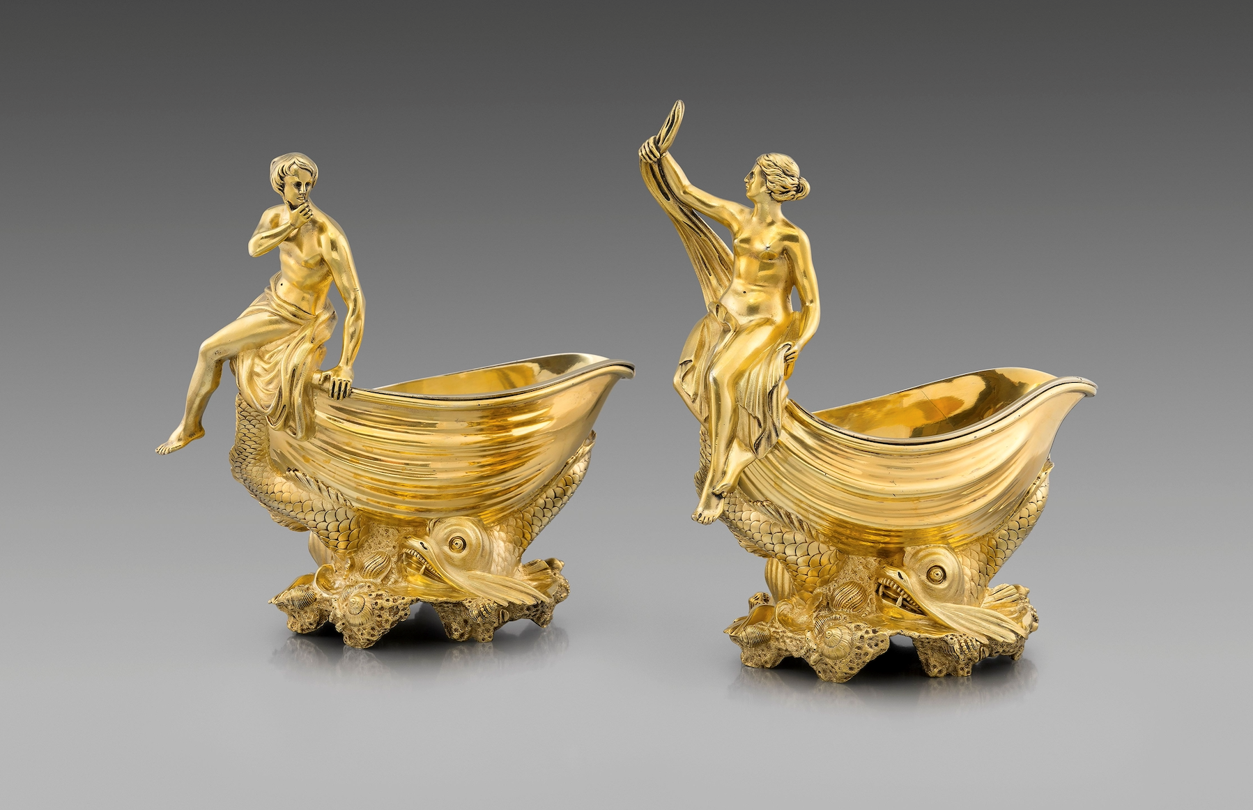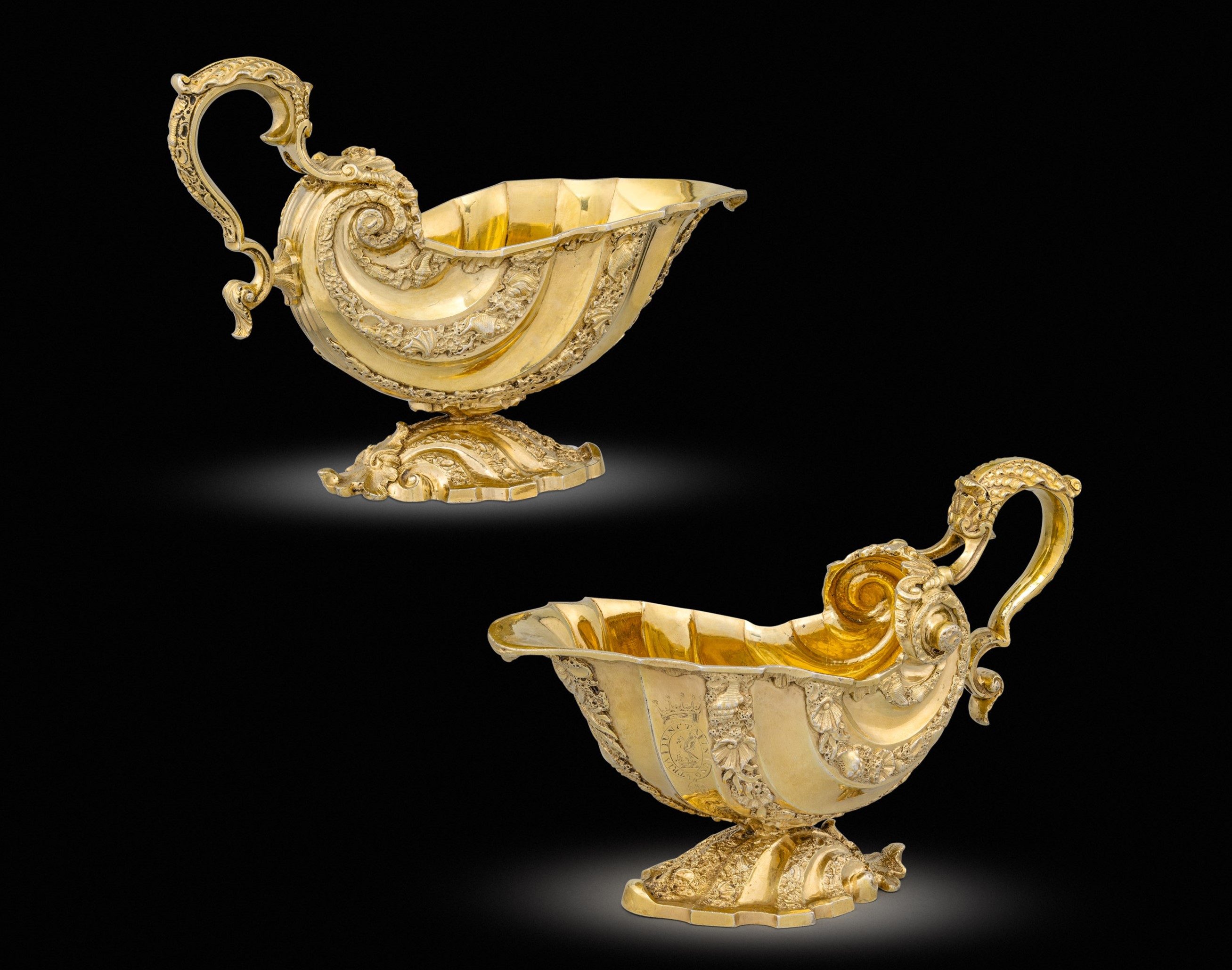 Today we would like to present a pair of exceptional sauceboats that is amongst our most recent acquisitions. They are marked by Robert Garrard II and date to 1820. Each one is shaped as an oval vessel that rests on a base of dolphins and shellwork. The handles are formed as Venus, narcissistically admiring her reflection in a hand mirror, and Adonis, who stares at his companion in a pensive pose. The detachable liners are marked by Sebastian Crespell II. They are a very special piece as they are modelled after the pair in the Royal Collection (RCIN 51271) made in 1743-44 by Nicholas Sprimont for Frederick Prince of Wales. https://www.rct.uk/collection/search#/4/collection/51271/sauceboat-and-stand The story of our sauceboats is closely linked to the incredible Marine Service that fascinated scholars for centuries as some of the most incredible master silversmiths took part in its creation. Frederick, Prince of Wales (who lived between 1707 and 1751) was a man of refined taste and elegance. He had access to some of the finest makers that, right in those years, were pioneers in spreading the French taste throughout England. The French Huguenot community was settling in their new elected land after escaping the terrible persecutions that forced so many talented artisans out of France. Fortunately, they were able to bring with them their most valuable asset, their skills, and that is how the Rococo style reached spectacular results in England. The Royal Collection’s Marine Service is the most majestic group of English Rococo plate and it truly represent the incredible creativity and magic of the English Rococo which clearly found its most natural expression in silver items, thanks to the material’s fluidity, ductility and splendour. The Royal Collection records mention the Prince’s taste for fish and seafood dishes, which found fertile ground with Rococo’s basic aesthetic principle of using elements of the natural world to create astonishing compositions and dramatic pieces. According to silver historian C. Oman, Nicholas Sprimont started working on the Royal Collection’s Marine service shortly after his arrival from France into England. Having not been able to register his own mark, his colleague Paul Crespin marked the first and largest piece in the Service, the Neptune Centrepiece, as it was common practice amongst silversmiths at the time. Throughout the decades, a number of English silversmiths copied items from the Marine Service as the Service was immensely popular amongst aristocracy due to its refined execution and theatrical presence. The Service was so treasured that George IV commissioned in 1827 an even grander stand for its Neptune Centrepiece, nearly 100 years after it was made, to keep the piece relevant in the ever-changing royal taste. Its magnificent marine elements were extremely influential to the development of the Regency and George IV taste for spectacular pieces. The workshop of Rundell, Bridge and Rundell studied the pieces carefully before being able to design elements that could complement the style of the Service and, by 1820, virtually identical architectural marine elements can be found on a vast number of important pieces produced by Paul Storr and some other makers with royal association. In 1803 Robert Garrard marks an extraordinary set of Four Gilt Wine Coolers for the 3d Baron of Grantham. The elaborate bases, of intertwined dolphins, is directly inspired by the Marine Service, proving how Garrard was already familiar with its astonishing details even before producing the sauceboats. We believe the present pair, marked by Robert Garrard and dated 1820, to be the same set that came to the market, through Christies’ auction house, as part of the majestic C. Ruxton and Audrey B. Love Collection, one of the greatest collections in the world of silver gilt pieces. https://www.christies.com/lotfinder/Lot/a-pair-of-george-iv-silver-gilt-sauce-4336432-details.aspx Another pair was also sold at Christies in April 2004. https://www.christies.com/lotfinder/Lot/a-fine-pair-of-george-iv-silver-gilt-4263011-details.aspx The Virginia Museum of Fine Arts has two pairs of a very similar model, 97.68.1a-b, but executed in white silver, proving how popular this extraordinary design was. It is not surprising that Robert Garrard II, silversmith and goldsmith to the Crown, is asked to produce more pieces modelled after the Marine Service items (for a similar case see a coffee pot from the collection of the Victoria and Albert Museum M.18-1981, modelled by Garrard in 1835 following a famous Rococo model of 1760). By reproducing the Marine Service, considered as it was the most iconic Rococo group of plate, Garrard was pursuing the very common practice of paying homage to the grand masters that shaped English art history, carving out a place for himself amongst them. Chiara SPdF