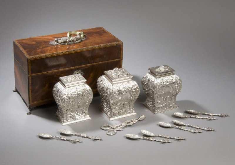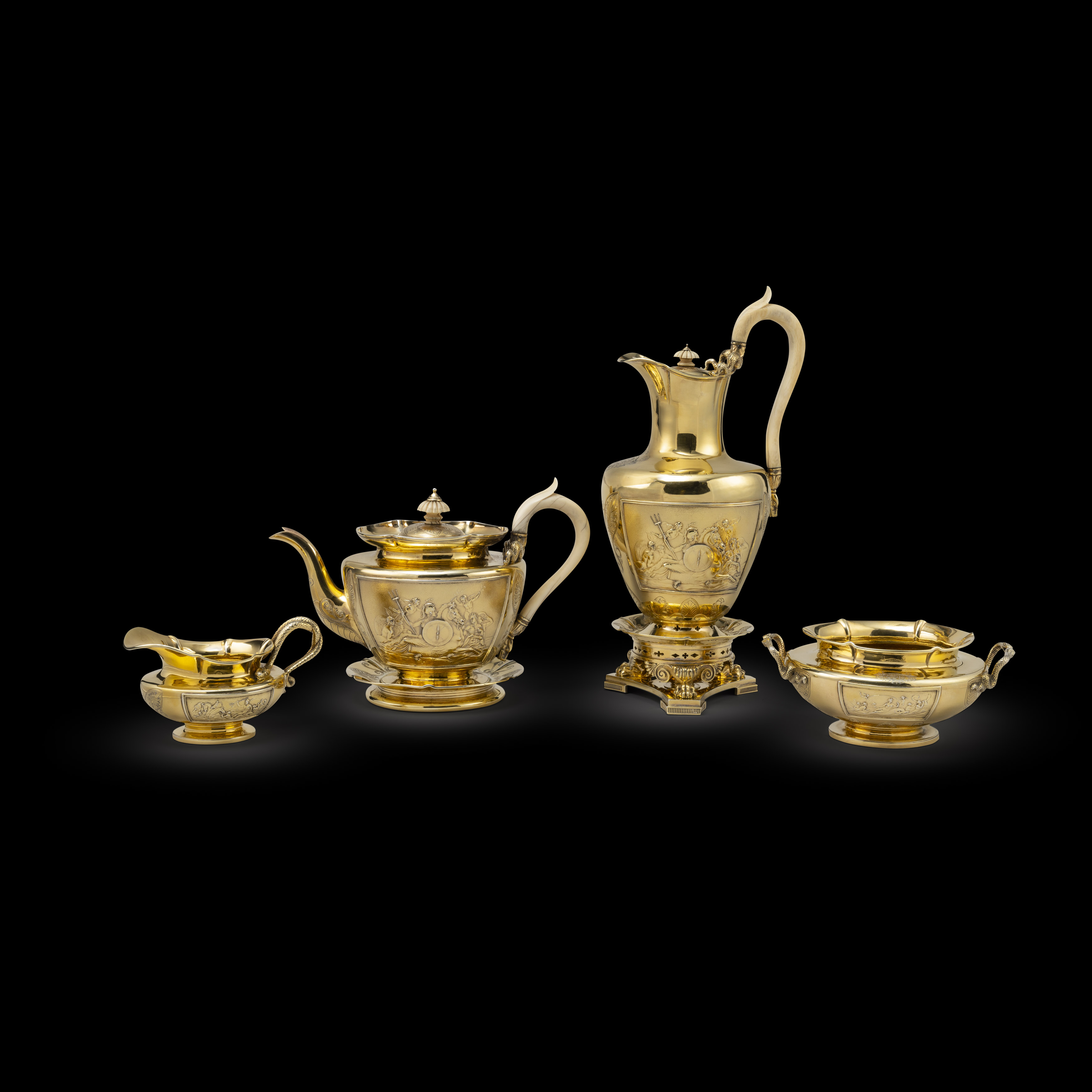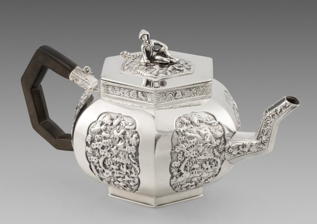 As Vice Admiral and then followed with his promotion to Admiral of the fleet, Sir Charles Ogle, 2nd Baronet would have needed a fitting tea and coffee service to suit his rank and meet his needs to entertain in the right manner. At this moment in the 19th century there was nothing more fashionable, than the fantastical tea services that Edward Farrell was creating in the ‘Teniers Style’ This weeks Director’s Choice focuses on this wonderfully complete five-piece tea and coffee service. The tea and coffee service beautifully chased and cast with scenes of drunken revelry and pub scenes. The kettle also with a fabulous boar’s hunt scene and hound masks to its’s feet and stand. The kettle also with its original wicker handle surviving intact.