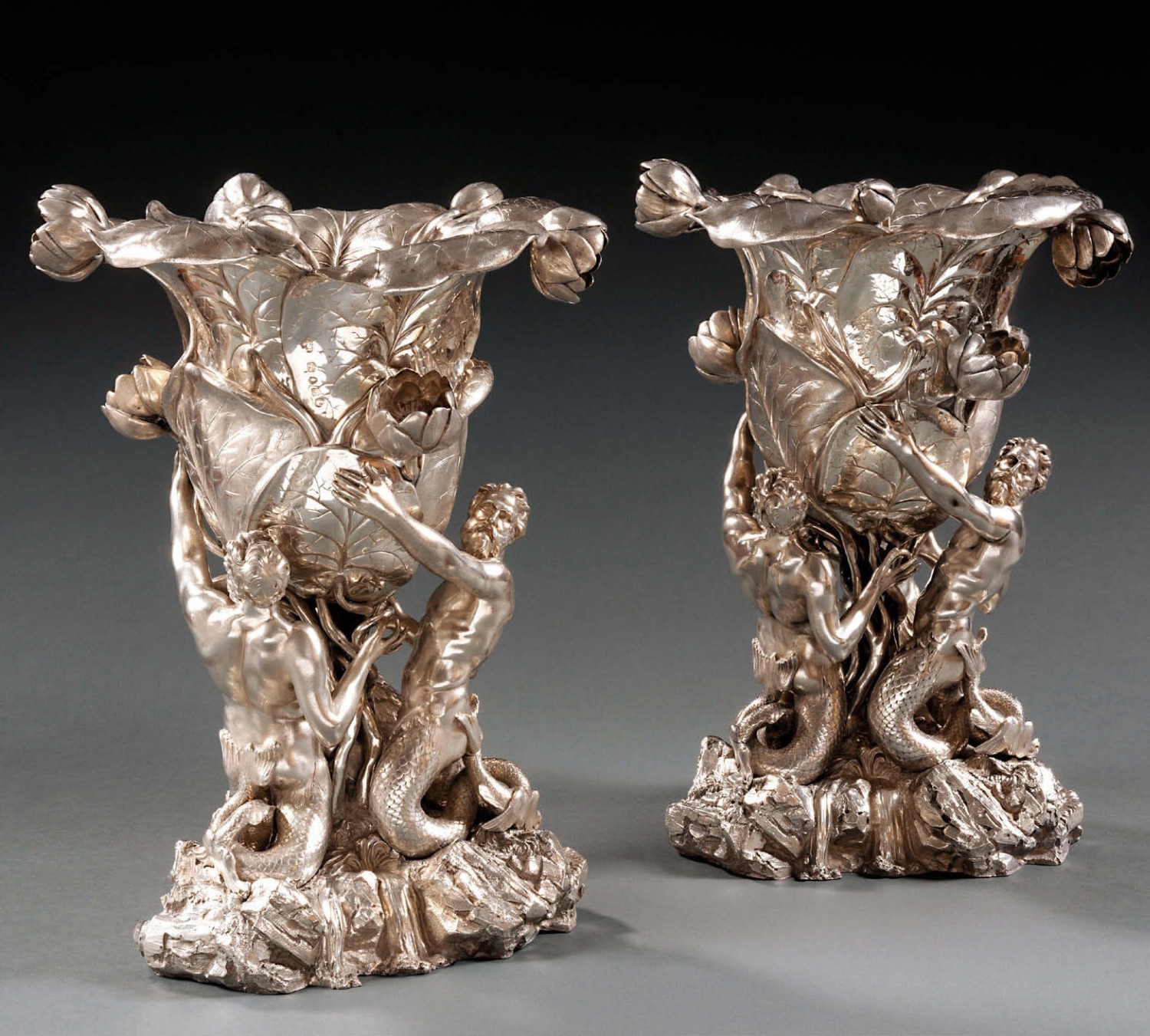 Today we are featuring a striking pair of Victorian figural vases, dated London 1849 with the maker’s mark of Hunt & Roskell. The vases are further stamped with the retailer’s mark of Hunt and Roskell, late Storr and Mortimer. Standing nearly 40cm tall and weighing 11 kg. The triangular bases are adorned with three tritons, Greek Mermen. The bowls are formed as overlapping water lily pads which are embellished with buds and blooms. The figures were made by Paul Storr and each is engraved on the right arm. The provenance is unclear before 1992 when they came up for auction at Sotheby’s, New York on 27th April where they was bought by a private collector. Detail of Hunt & Roskell, An Incredible Pair of Victorian Figural Vases at Koopman Rare Art The lily pad design used to create the bowls of these vases is the same design used in a pair of wine coolers made at Hunt and Roskell in 1848 for presentation to Edward 1st Earl of Ellenborough (1790-1871). Instead of tritons, their bases supported figures illustrative of life in India in commemoration of the Earl’s tenure as Governor-General there between 1842 and 1844. Detail of Hunt & Roskell, An Incredible Pair of Victorian Figural Vases at Koopman Rare Art The coolers were part of a service which Queen Victoria and Prince Albert were shown at Hunt & Roskell in February 1848, for which they ‘were graciously pleased to express their high admiration.’ (The Morning Chronicle, London, 16 February 1848, p. 6d) Although Hunt & Roskell employed the services of several artists at this time, including Frank Howard (1805-1866) and Alfred Brown, both of whom began their association with the firm in the mid-1840s, they worked under the superintendence of the sculptor Edward Hodges Baily (1788-1867). It is he to whom the design of these and the Ellenborough coolers has been attributed. An Incredible Pair of Victorian Figural Vases at Koopman Rare Art The concept was not new, however; a book of miscellaneous prints of designs for vases inscribed ‘No. 202 Storr & Mortimer 13 New Bond Street,’ which must have been known to Baily, includes an engraving after Jacques-François Saly (1717-1776) in which a shell-like vase is supported by tritons. Courtesy of the Victoria & Albert Museum, London. Vases inventés et gravés par Jacobus Saly . Jacques-François-Joseph Saly (1717 – 1776) These naturalistic forms, so brilliantly adapted for silver at Hunt & Roskell during the 1840s, probably found their most extreme expression in the shell and coral pattern tea and coffee set, London, 1849, which they showed at the Great Exhibition of 1851 (John Culme, Nineteenth-Century Silver, London, 1977, pp. 158 and 159) E.H. Baily began working under John Flaxman for Rundell, Bridge & Rundell while still a student and when Flaxman died in 1826 he became Rundell’s chief designer and modeller. Detail of Hunt & Roskell, An Incredible Pair of Victorian Figural Vases at Koopman Rare Art In this post he inevitably worked most closely with Paul Storr, who until February 1819 was in charge of the firm’s silver manufactory in Dean Street, Soho. Storr subsequently set up his own factory in addition to going into partnership two years later with John Mortimer to form the retail business of Storr & Mortimer, goldsmiths and jewellers, in Bond Street. Baily joined the new firm and continued to work with Storr and his successors until 1857. These works are available to view in our gallery located at Koopman Rare Art, The London Silver Vaults, 53/64 Chancery Lane, London, WC2A 1QS For all enquiries please do not hesitate to call or email on: 0207 242 7624 / info@koopmanrareart.com