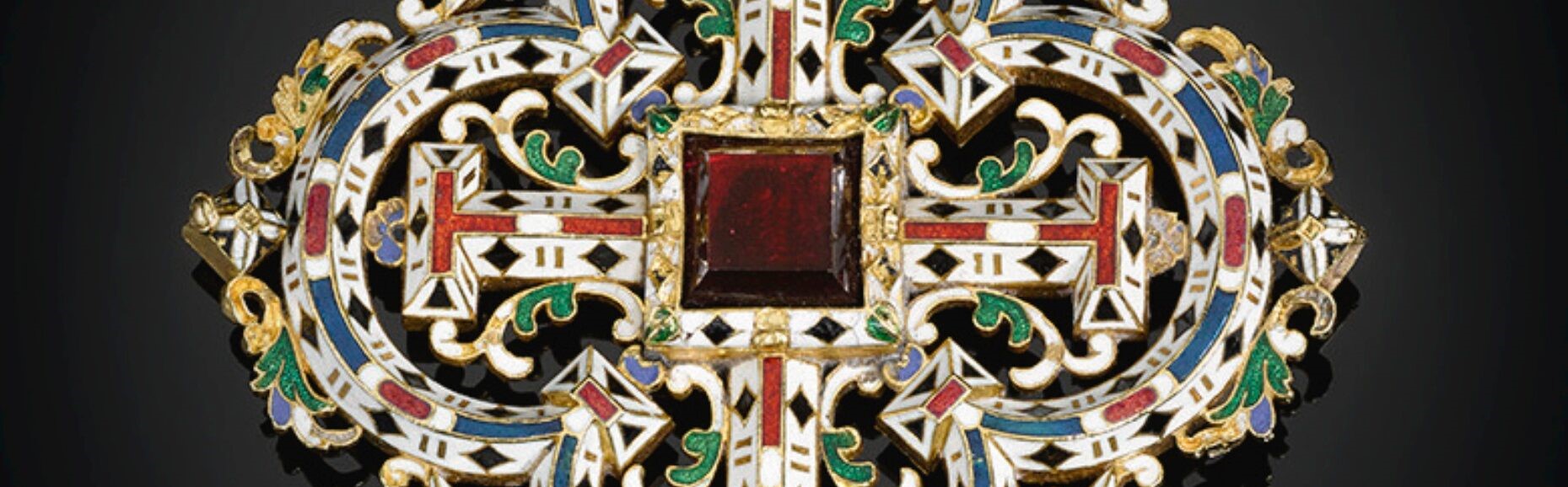 A partially enamelled gold, diamond and garnet Spanish pendant cross of Jerusalem, 3 1/6 by 2 11/16 inches. An exquisite example of an early Spanish jewel. The pendant takes the form of a Jerusalem Cross which is set with diamonds picked out with red and white cloisonné enamelled foliate adornments. To the reverse the pendant is enamelled with a geometric pattern in red, blue, green and black. This intricate design is set against a white ground and centred upon a large table cut garnet. The inclusion of diamonds instead of crystals indicates the high status as a piece of devotional jewellery which was likely to have been made for a member of the Spanish court. Detail of Pendant cross of Jerusalem, Spanish, Circa 1625-1630 It is believed that the cross was exhibited at the South Kensington Museum in 1862. An entry from the catalogue closely matches the description of the pendant : The pendant is known to have entered the collection of the Hope family, the exact date is unknown. The Jerusalem cross was probably purchased by Thomas Hope (1769-1831) or Henry Philip Hope (1774-1839). The Hope family were renowned for their collection of jewels, famously owning the Hope diamond. Henry Thomas Hope inherited the Hope diamond from his uncle and the rest of his jewellery collection. Detail of Pendant cross of Jerusalem, Spanish, Circa 1625-1630 A pendant of this quality and design is one of the earliest examples of Spanish jewels and would have been owned by someone of the highest nobility. It has been suggested that comparisons can be drawn between the pendant and a jewel depicted in a painting held at the Museum Cerralbo. The oil on canvas is attributed to teacher and father-in-law of Diego Velázquez, Francisco Pacheco. The work illustrates a Franciscan Priest, Saint James of the March of Ancona standing over an unknown male and female who gaze out of the canvas to the viewer. The lady wears a beautiful pearl necklace with complimentary drop earrings. Her dress is adorned with intricate gilt embroidery. However, it is the beautiful cross pendant to which our eyes are drawn. One can notice immediately the same colourless stones and white and red enamelling. The cross in the painting whilst it appears simpler with fewer stones this may be simply down to artistic license. It would be extremely interesting to investigate the couple in this religious portrait to trace back the provenance of the pendent past the Hope family. Attributed to Francisco Pacheco, Franciscan Priest, Saint James of the March of Ancona, Oil on canvas, Courtesy of Museo Cerralbo, Madrid, Spain These works are available to view in our gallery located at Koopman Rare Art, The London Silver Vaults, 53/64 Chancery Lane, London, WC2A 1QS For all enquiries please do not hesitate to call or email on: 0207 242 7624 / info@koopmanrareart.com