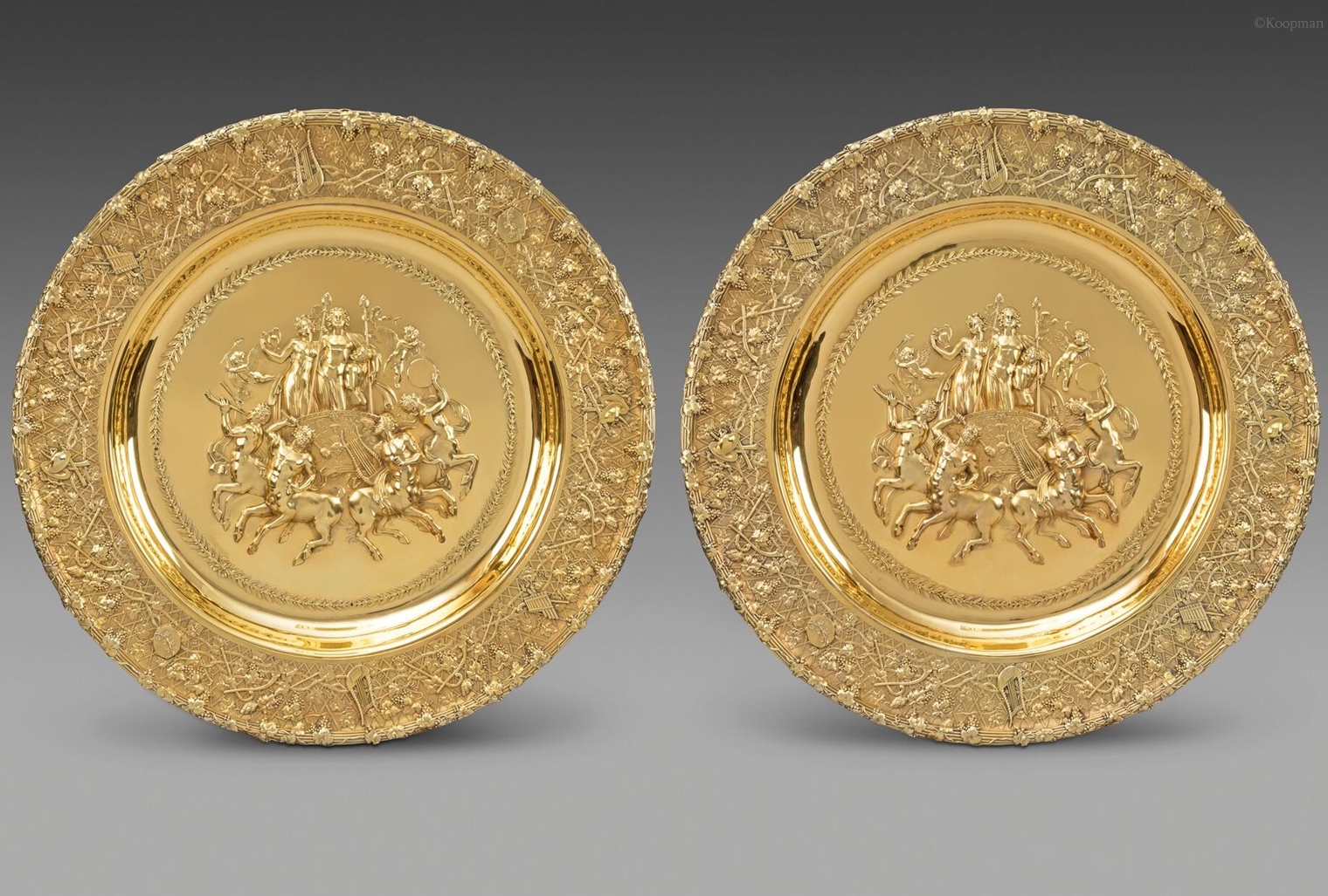 At Koopman Rare Art we have some exquisite examples of Odiot’s work in silver-gilt dating between 1983-1992. A large French silver-gilt centrepiece which was made after a design circa 1817 of A-L-M Cavelier for Jean Baptiste-Claude Odiot. The circular base is cast and chased with a band of stylised foliage on a matted ground. The hemispherical bowl is supported on cast figures of Ceres, Bacchus and Fame. The bowl is applied with a band of trailing vines, dolphins and bulrushes, with Bacchic female mask and double serpent handles. This sumptuous tureen was first manufactured in 1817, as part of a set of 219 pieces commissioned by Count Demidoff. The original piece is presently exhibited at the Louvre museum.