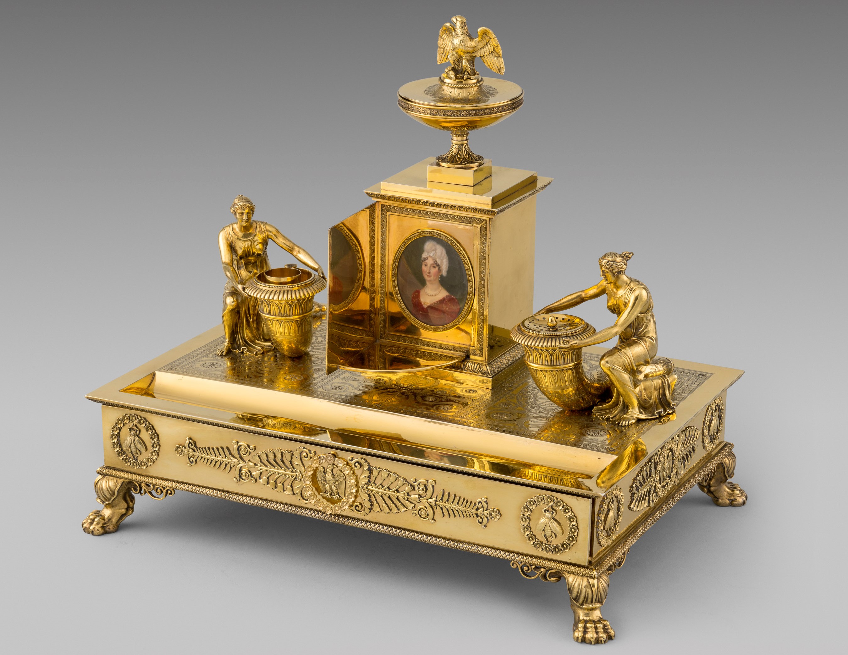 As the name suggests, the Madame Mère inkstand was made for Letizia Ramolino, Napoleon Bonaparte's mother, and gifted to her son, King Joseph, in 1812, as testified by the documents contained within the inkstand. 1812, the year this glorious object was commissioned was a year of significance as it marked a critical transition in Napoleonic history. The French Empire was at its greatest extent in 1812. Having been crowned Emperor of France in 1804, the years between Napoleon's coronation and 1812 are defined by the historians as the years of the Napoleonic wars, as France was in constant conflict with the various European powers. On the battlefield, Napoleon experienced enormous success: France defeated the Austrians and the Russians in Austerlitz (1805), Prussia in Jena (1806) and Spain (1808) in the Iberian Peninsula. Then, believing himself invincible, Napoleon launched an offensive in Russia in 1812. However, the venture turned out to be a spectacular failure. In pursuit of the Tsar's army, which continued to retreat eastward, the French were annihilated by the severe Russian cold. As so, 1812 marks the peak of Napoleonic grandeur and the last year of the Bonaparte's' fortune, which is well represented by the splendour of this empire-style vermeil inkstand.