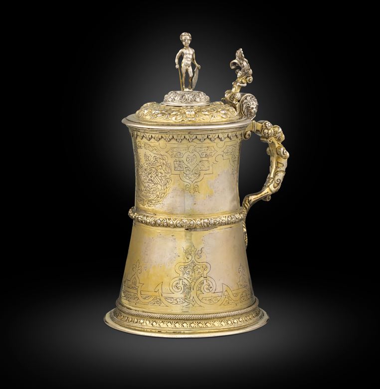 There is no doubting the expansion of both the population of London in the Elizabethan period and the leap in the economy largely due to the increase in trade overseas; encouraged by the infrastructure put in place to harness this growth. This new wealth, as well as the reformation of the church under Henry VIII, influenced the activities of the goldsmith in England, creating a huge demand for new plate and in particular silver for the communion. However, the silver tankard together with other drinking vessels had a special place in the 16th century with the diversity at this period was much broader in range than in later centuries to come. David Mitchell’s most recent book on the Wider Goldsmith’s Trade in Elizabethan & Stuart London certainly highlights this fact with an insight into the records at the goldsmiths’ Company Court Books, 1560 -1679, pg. 170. Communion cups, Magdalen cups, Beer bowls, Cans, Tankards, Tavern bowls, Monsieur bowls and Tavern cups are listed to name but a few. The owners social and political status also had a large part to play in the production of the tankards too. Our tankard was most likely part of the household’s buffet. The buffet display of plate was an important feature of medieval and Renaissance banquets. Often made of oak or walnut, buffets usually stood at the side of a dining room, their shelves filled with tablewares. Gold and silver vessels were displayed to convey a sense of the owner's wealth. Normally these vessels were used for the service of food and drink, but on great state occasions they would be set out purely for display. The ritual of dining and the fashion of the food that was served in the Elizabethan period would again have played a part in this treasure’s creation. Taking your tankard from the buffet to your place at the table would have caught the attention of others and made them focus on your silver tankard or in this case, the even more opulent gilded silver used to create this tankard makes it all the more special. The fact that this was originally one of a pair of Elizabethan tankards together with its pristine condition makes this glorious object my Director’s Choice for this week.