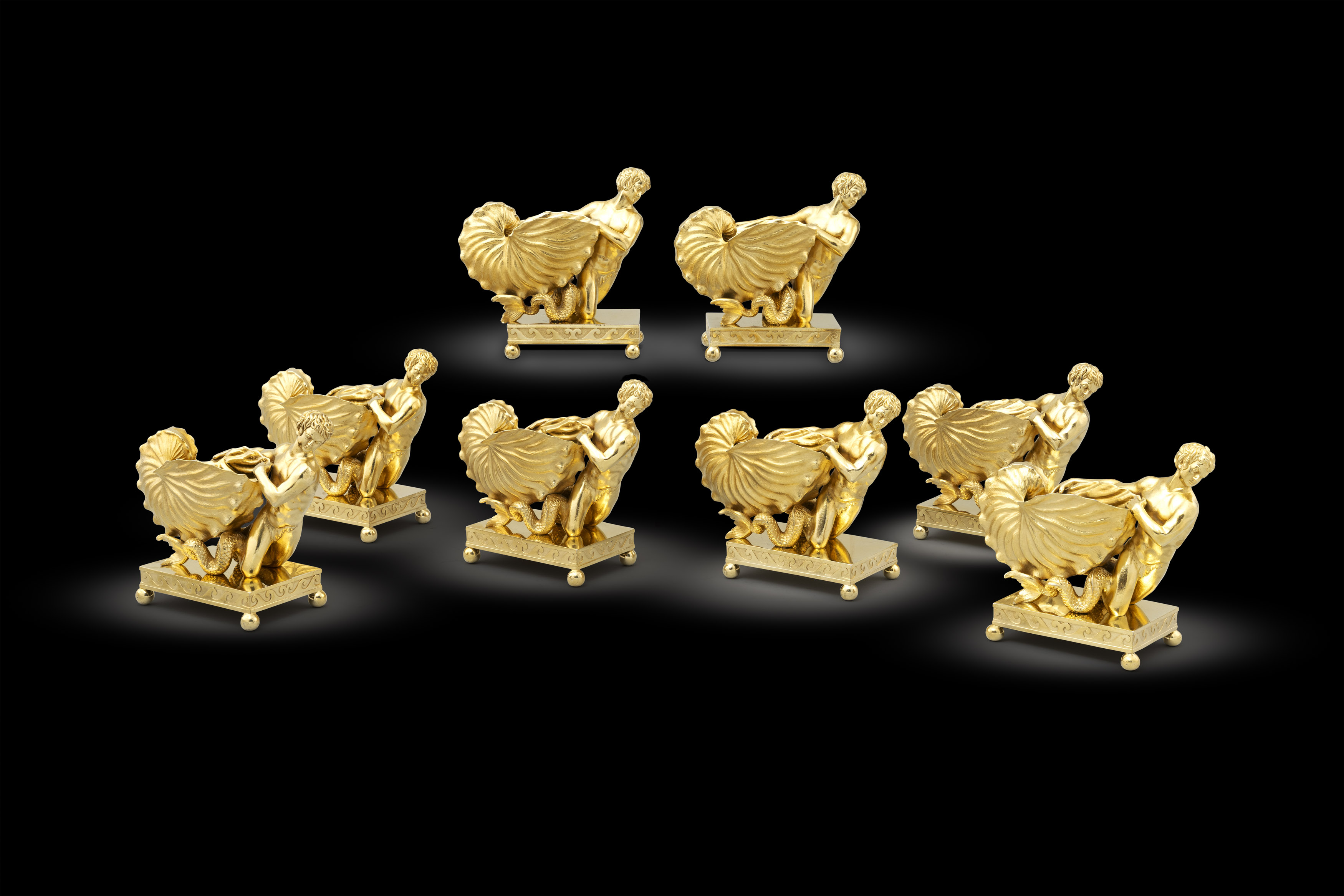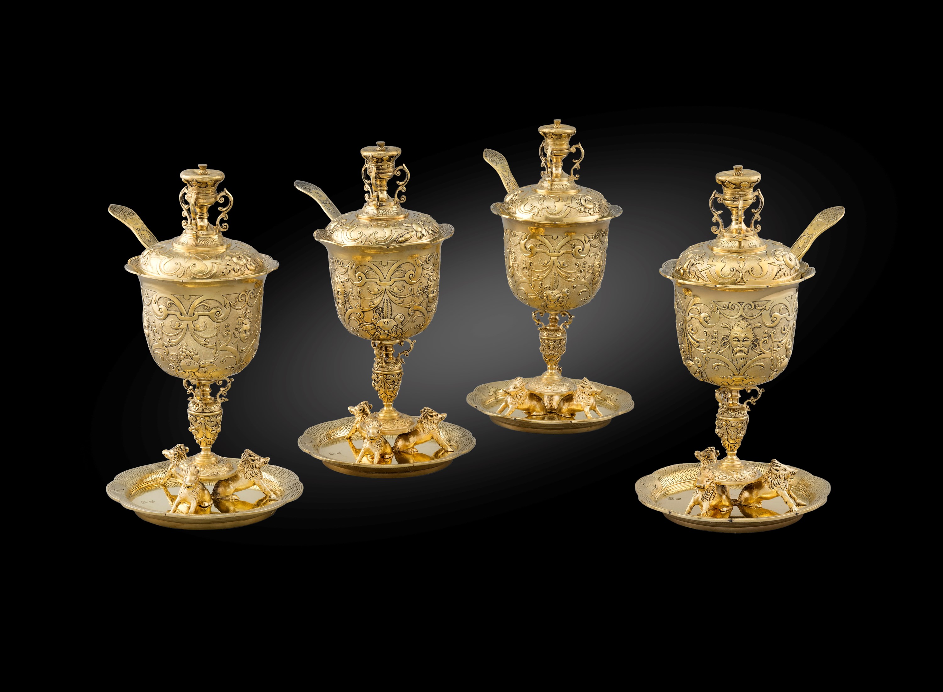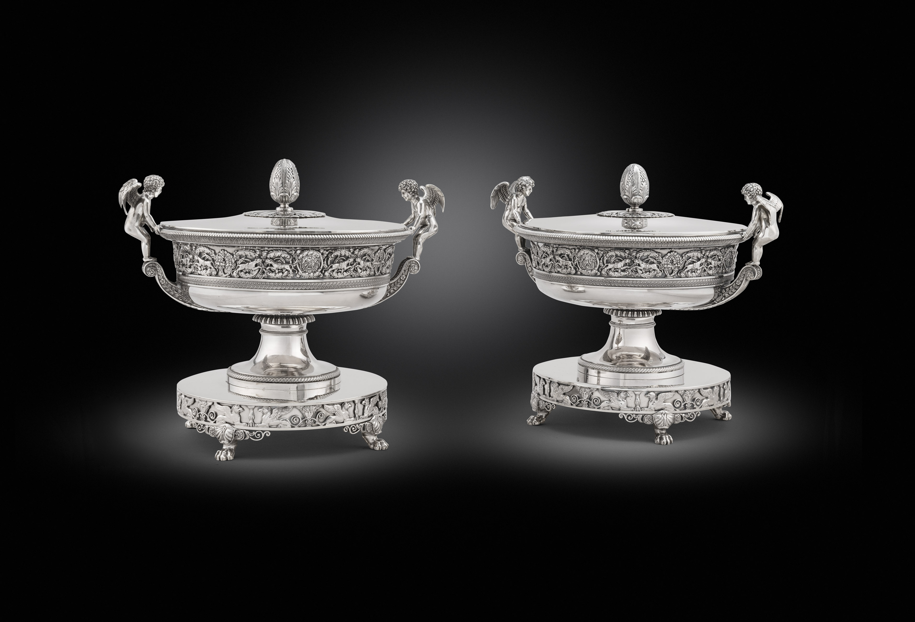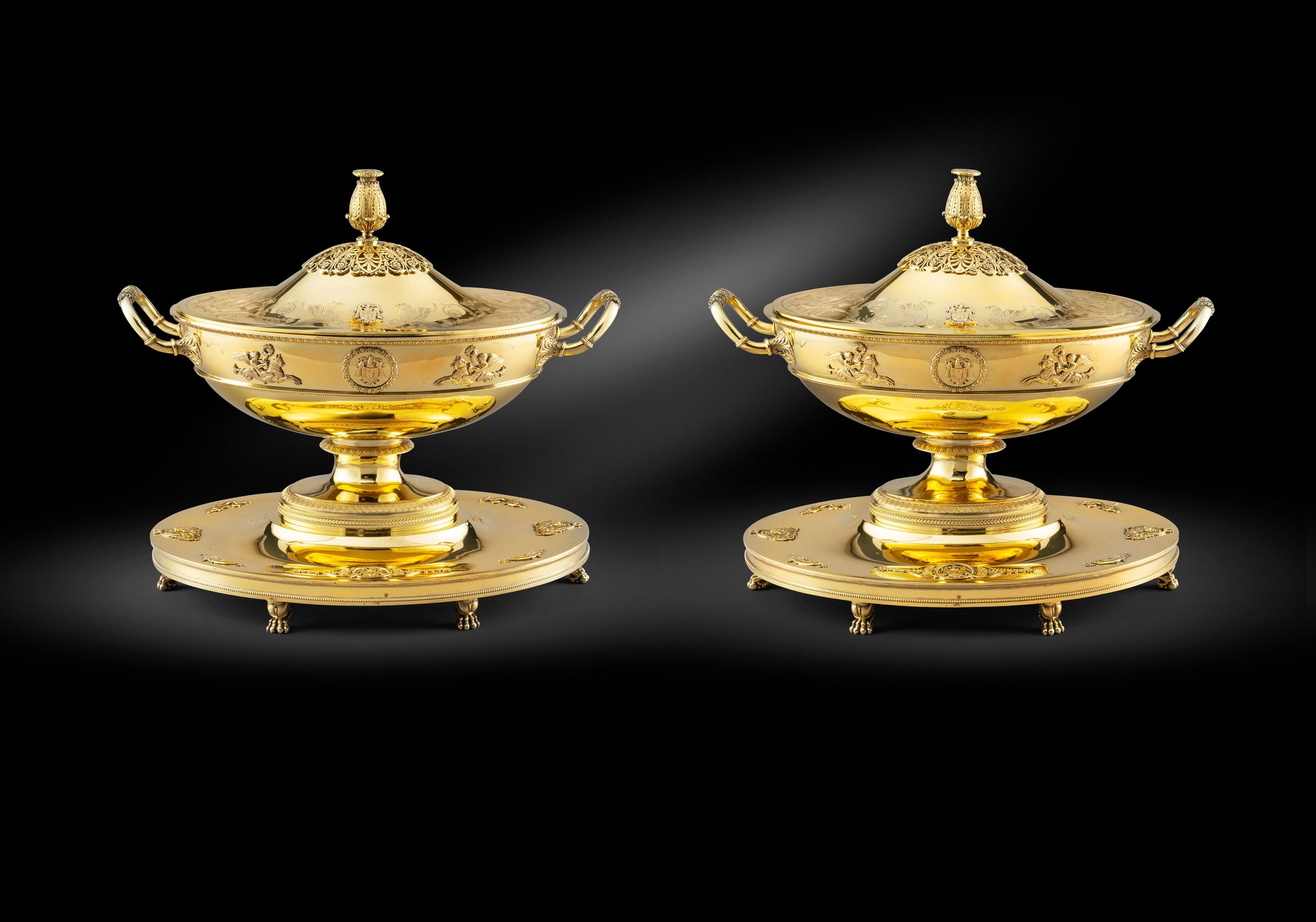 Another highlight piece in our collection is a pair of French soup-tureens, covers and liners also in silver-gilt. The pair were made in Paris, 1990. Each oval and oval base is cast and chased with a band of stylised foliage on a matted ground. The oval bowl is supported on a pair of cast winged kneeling figures of winged Victory. The bowl is applied with a band of trailing vines and the slightly domed cover is adorned with foliage and bud finial. The bases, covers and liners are further stamped ‘Odiot a Paris’ the bases further numbered ‘9025’ and ‘9026’ and dated ‘1990’.