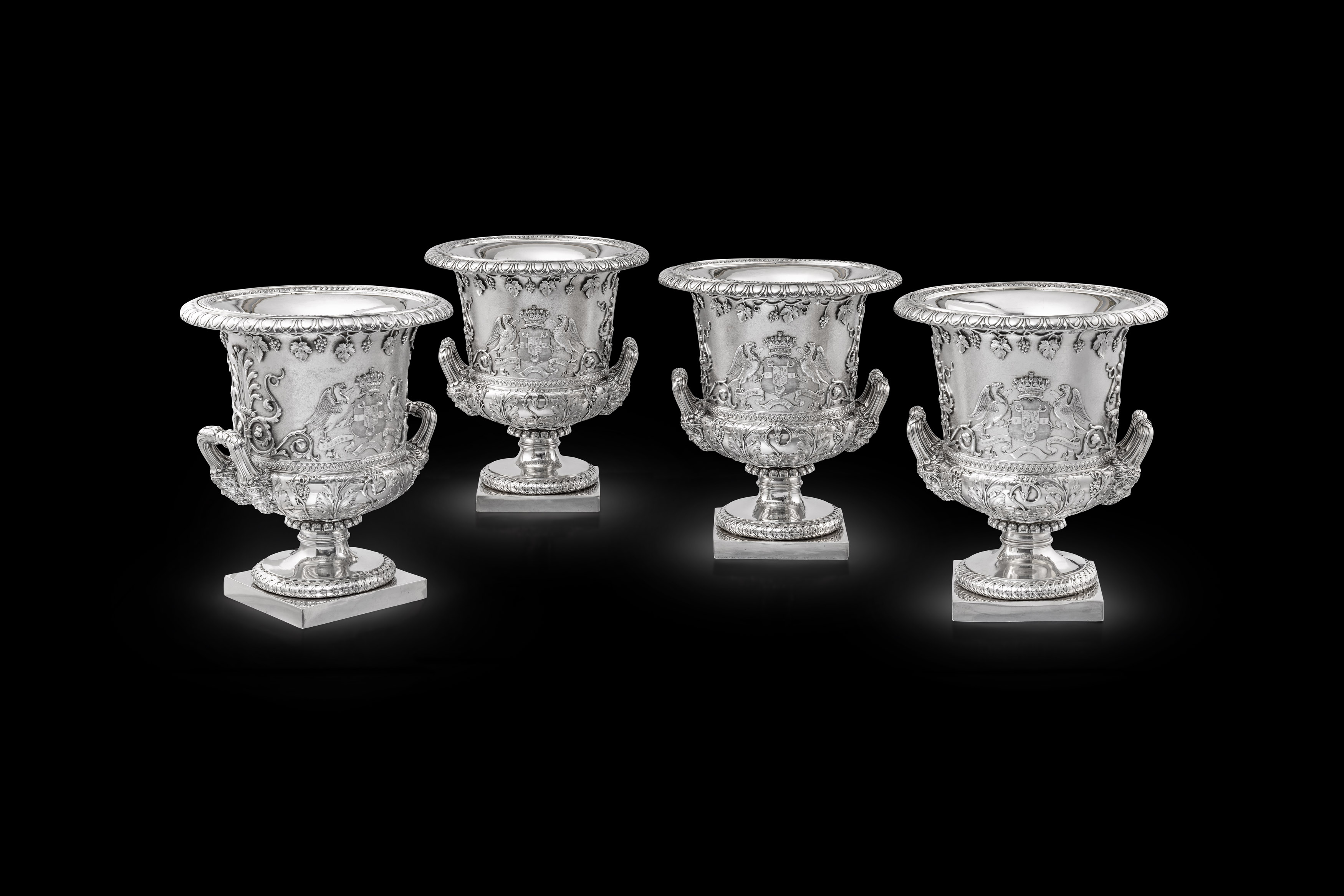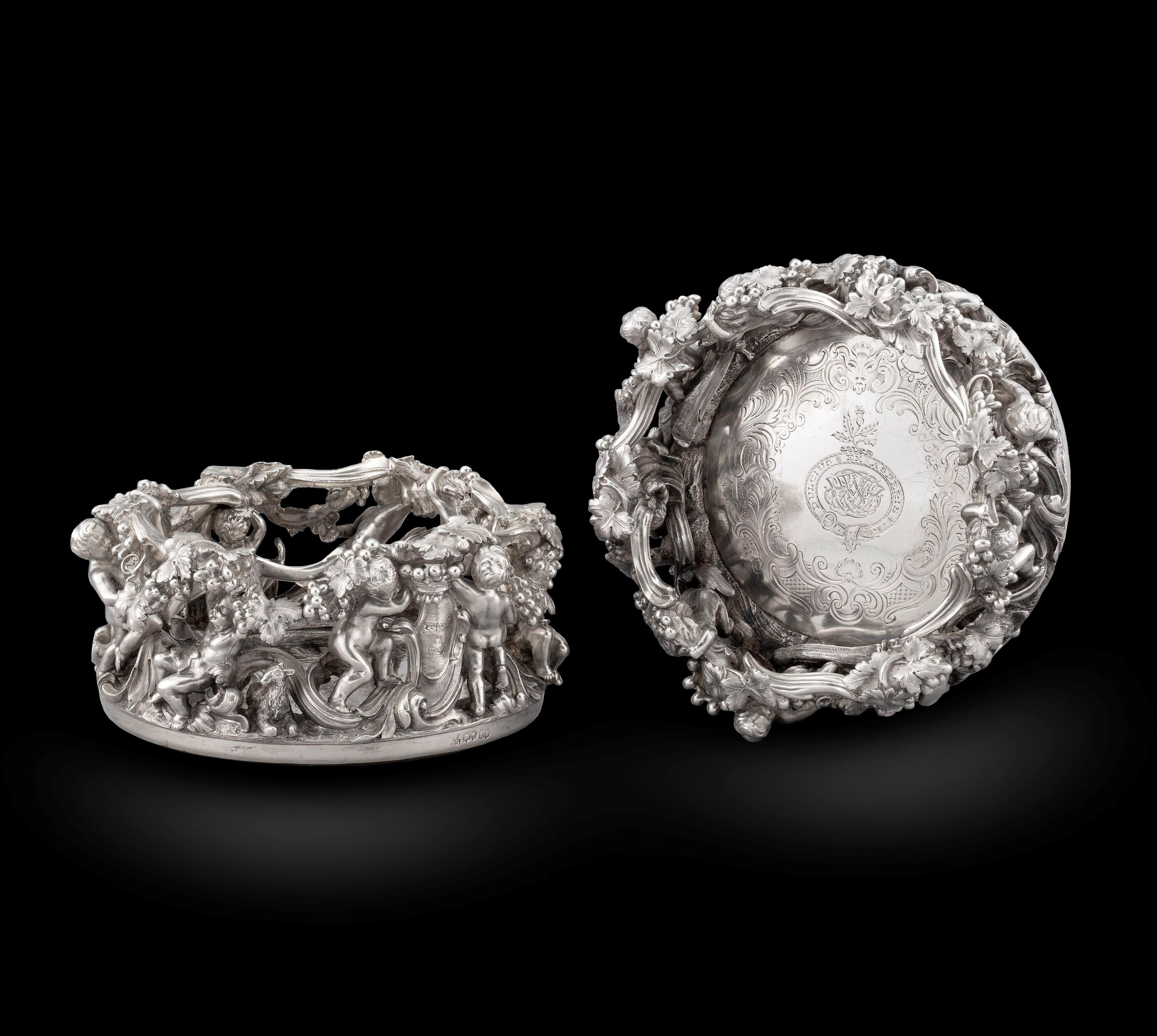 In all the years of handling silver these are the finest Victorian wine coasters we have had the pleasure to be the custodians of. With an extraordinarily elaborate border of harvesting bacchic putti, goats and vine branches together with delicately chased leaves, the scale, quality and gauge is unrivalled with of a gross weight of 3,580g, (115 oz 2 dwt). The family’s crest, garter, motto and reverse cypher are set within a scheme of both plain and chased rocaille scrolls. To the underside of each are four casters, an uncommon feature enabling them to be wheeled down the dining table to the next guest. We are proud to present these celebrations of the love of wine that graced the dining tables of the clan Ferguson as this week’s Director Choice.