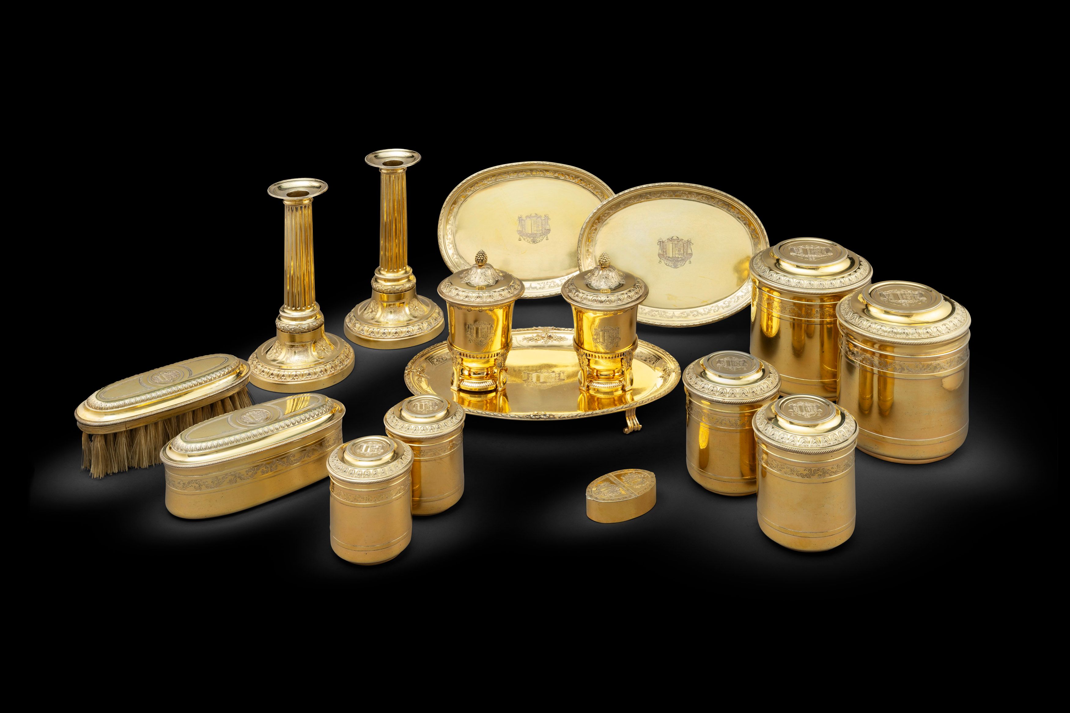Strasbourg is a city steeped in history of the goldsmith and its geographical location on the Rhine River has had clear influence from both the German and French courts to create an individual and spectacular style recognisable for its crisp lines and superb craftsmanship. The goldsmiths of Strasbourg have always had a penchant for the richness of gilded silver, and it is with this in mind that I introduce this weeks Director’s Choice. It is rare to find individual pieces in such good condition from Strasbourg but to find fourteen pieces belonging to one toilet service survive together with such a fascinating history is truly exceptional.