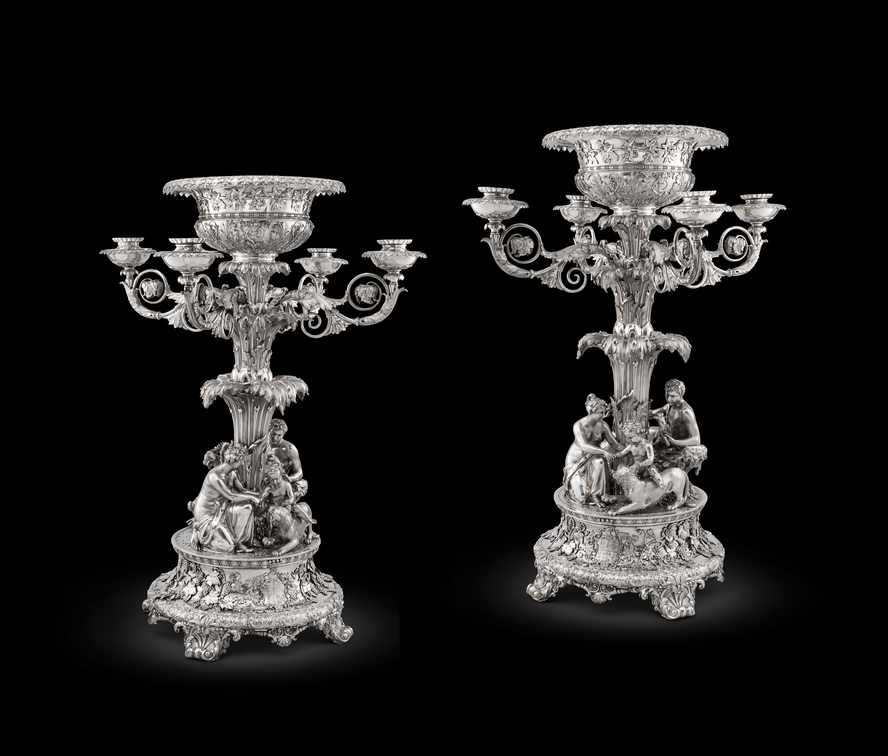 This magnificent garniture the focus of our Director’s Choice this week comprises of a jardiniere, two dessert stands and a pair of candelabra. The candelabra resting on triform altar bases resting on three scrolling acanthus feet interspersed with flowering trellis with quatrefoil flowers and beautiful spraying shells. The acanthus growing up the pearl edged bases to form ovoid cartouches engraved with scripted and intertwined initials The elegant figures of Venus sitting holding acanthus cornucopia and from these horns of plenty the floral acanthus branches of the candelabra burst scrolling upwards to support the flowering capitals which sit on top of the floral drip pans. The central finial of the candelabra formed as a blossoming sprig of flowers.