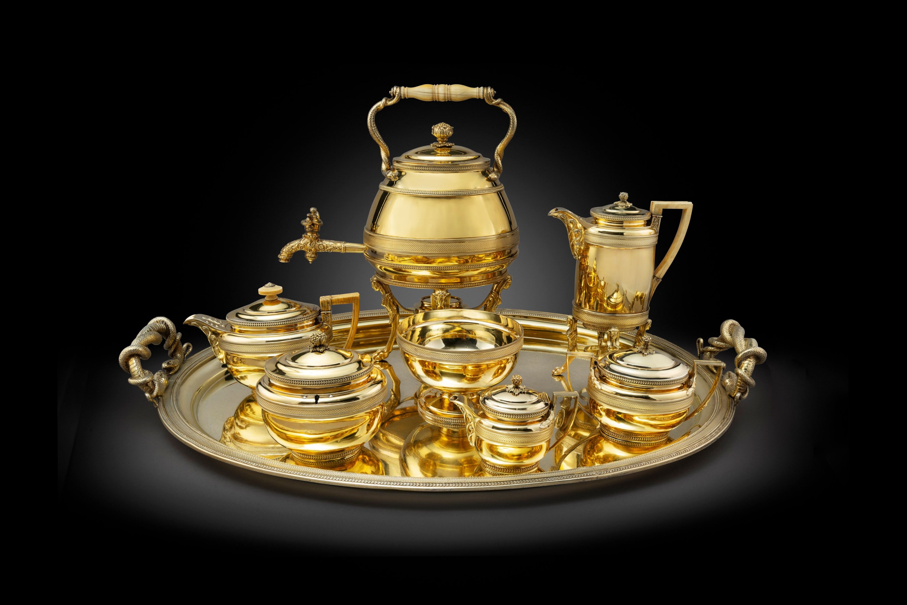 When seeking perfection in Neo-classical architecture one need look no further than this magnificent tea and coffee service which I am proud to present as my Directors Choice. With its jewel like finish it mirrors ancient forms to present vessels for the civilised ceremony of taking tea and coffee. Because of its beauty, design and quality this service captured the imagination of one of the great Regency designers.