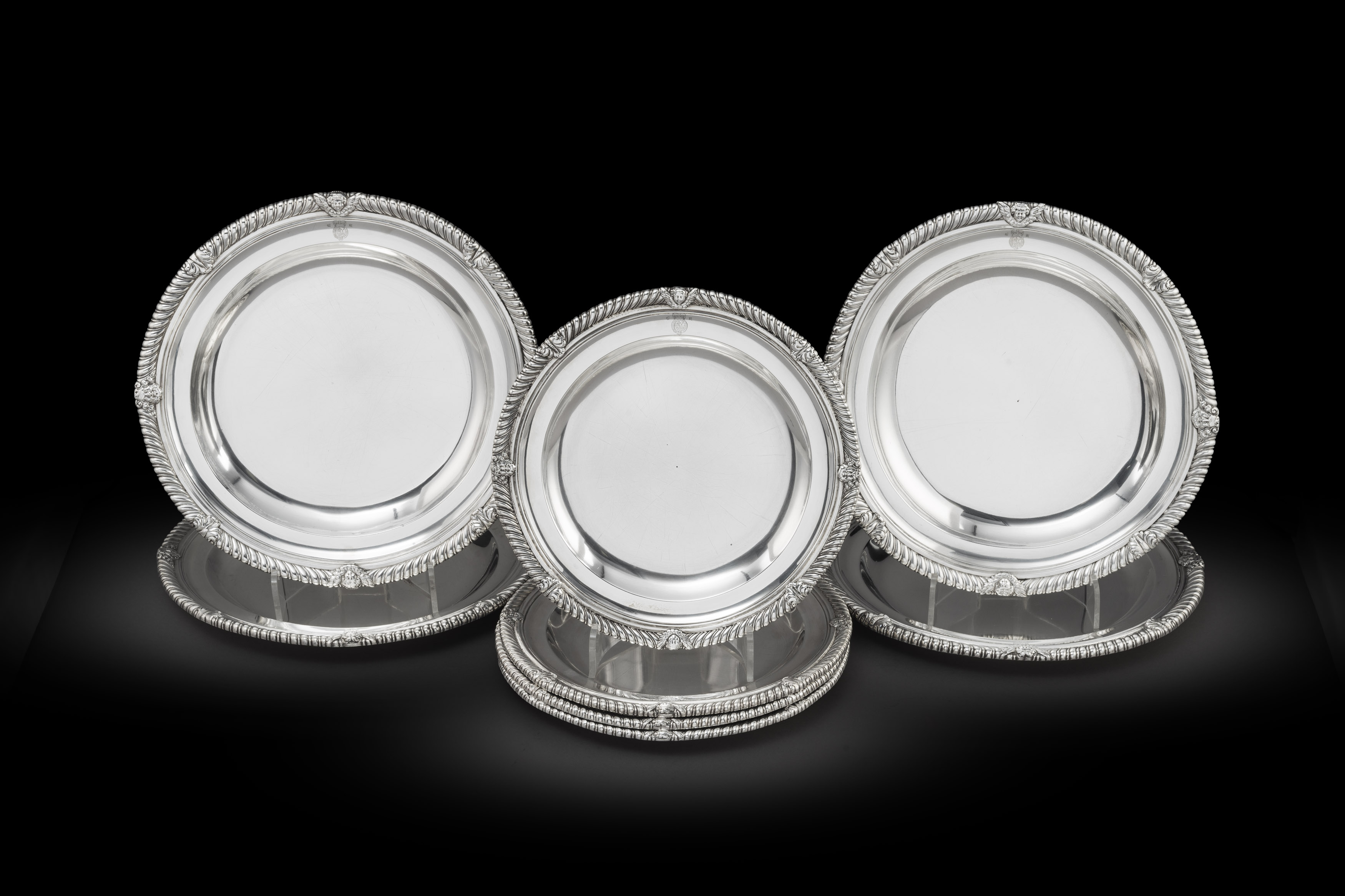 This week’s Director’s Choice focuses on one of the most incredible Ambassadorial services of the early 18th century; that of the plate issued to Philip Stanhope the 4th Earl of Chesterfield. He was appointed Ambassador to the Hague in 1727 and would have required the most lavish silver styled in the latest fashion of the day. This service represented the nation and thus bore the royal coat-of-arms of King George I. Aside from its function, the service was intended to show the power and wealth of England, and the scale and gauge of the individual pieces achieved this goal perfectly. We are privileged to present the serving dishes from the Ambassadorial service which were fashioned in two different sizes. The dishes have gadrooned borders with cast and applied bacchic and winged cherub masks interspersed by acanthus at equal intervals. They are also engraved with the Royal Arms and initials GR, marked on bases. It would seem this border was a feature of much of the dinner service and can also be seen on a pair of soup tureens bearing Paul Crespin touch mark that now reside at the Museum of Fine Arts Boston.