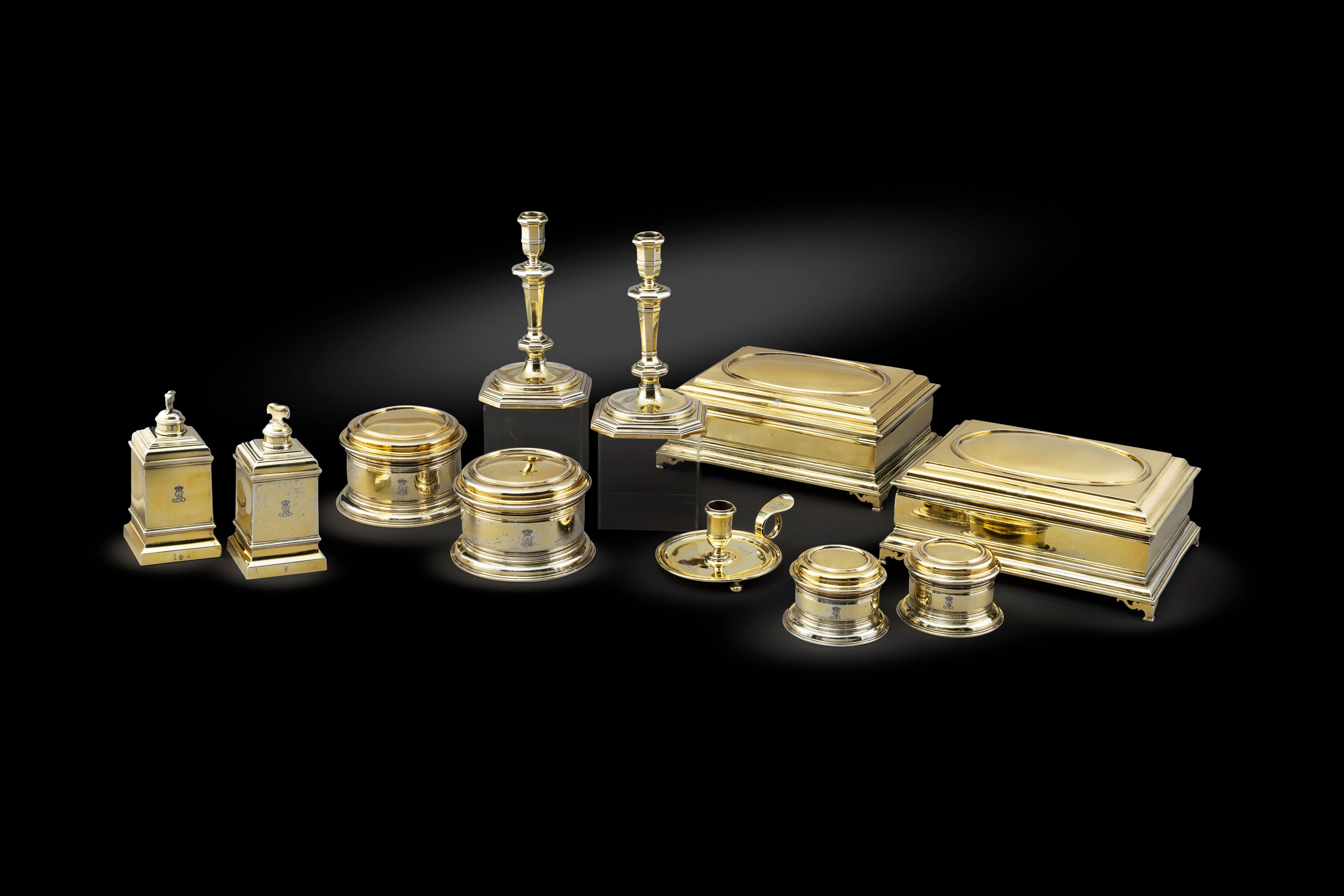 The inner sanctum of the grand houses during this period would have invited only the closest friends and esteemed guests to accompany the lady of the house as she prepared for an occasion. The word toilet comes from the French toile meaning 'cloth', and toilette ('little cloth') first came to mean the morning routine of washing, tidying hair, shaving and applying make-up as appropriate, from the cloth was often spread on the dressing-table where this was done. The most splendid silver would be on show to elevate the status of its owner, and to demonstrate their cognisance with the latest fashion of the period. The finest services were gilded to add further splendour to the silver. The Diary of John Evelyn (31 October 1620 – 27 February 1706), a gentlemanly Royalist and virtuoso of the seventeenth century, was first published in 1818. John Evelyn records in 1673 that Catherine Braganza had a set “All of massive gold, presented to her by the King, valued at £4,000”. This royal set comprises of twelve pieces and was commissioned for Princess Amelia Sophia Eleonor of Great Britain and executed in the finest quality by the goldsmith Benjamin Pyne. In 1715, he was appointed Subordinate Goldsmith for the coronation of the first Hanoverian king, George I, and in 1725 he was elected Prime Warden of the goldsmiths' guild. Pyne's work is often marked for its massiveness and simplicity. This service is so beautifully finished and of the utmost elegance that it is our Director’s Choice this week.