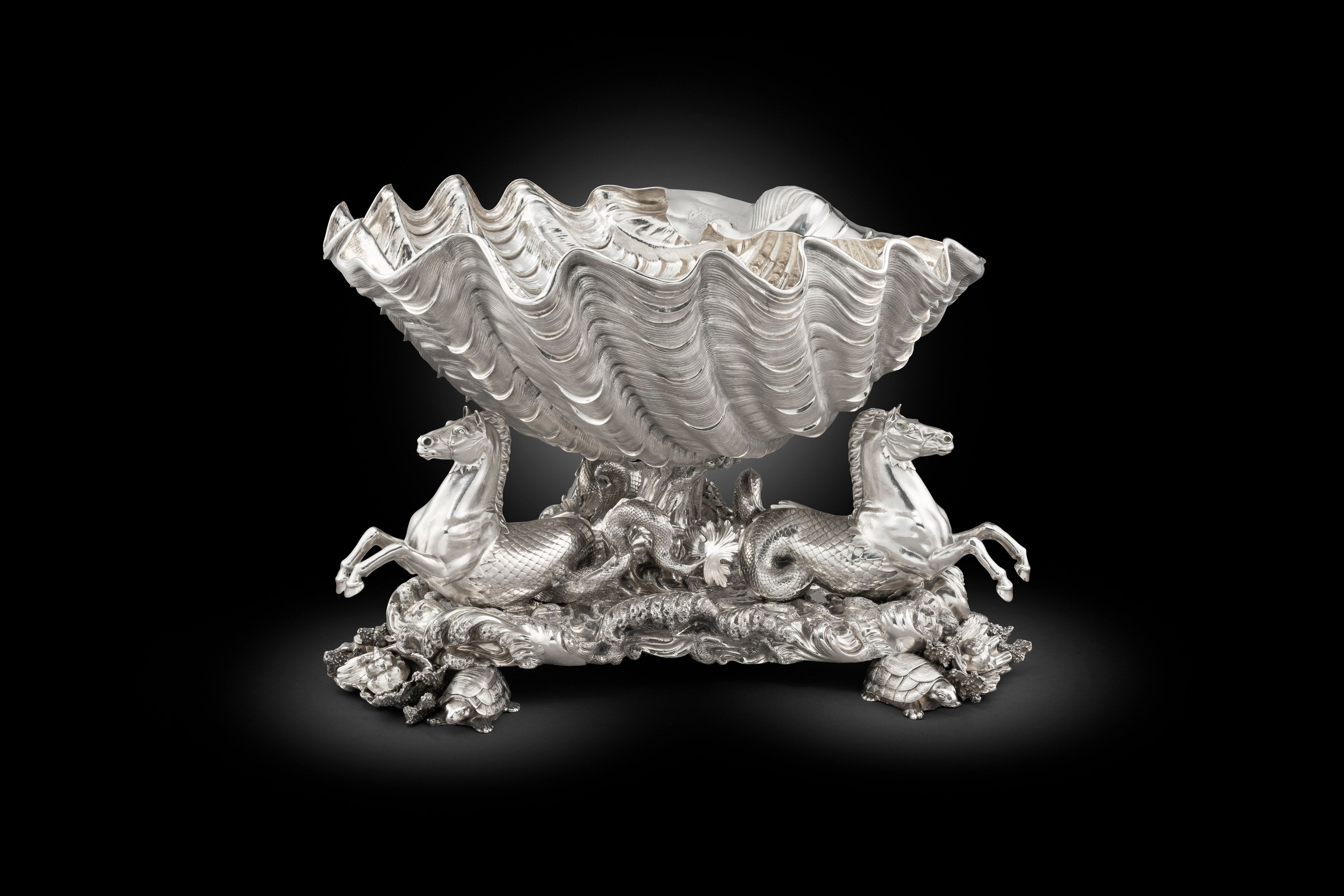 The Ferguson Marine Centrepiece The Neptune centrepiece in the Royal Collection has been discussed at length by Kathryn Jones and Christopher Garibaldi (‘Crespin or Sprimont? A Question Revisited”, Silver Studies, the Journal of the Silver Society, No. 21, 2006, pp. 24-38). Described as ‘the purest rococo creation in English silver’, it formed part of the table service displaying the most advanced French taste of the period. The marine theme of the piece, with its Neptune finial, swags of shells and pieces of coral and detachable dishes in the form of abalone shells, suggests it was used to serve fish soups and seafood. Bearing the touch mark of Paul Crespin on the plateau it is accompanied by sauceboats of 1743 and four salts which are by Nicholas Sprimont. It was further embellished by Rundell, Bridge and Rundell in 1826 by raising it on glorious hippocampi. The centrepiece modelled as a large shell supported by a frothing pillar of water, the triform base guarded at each of its three points by hippocamps on a crashing wave base, the feet composed of turtles, coral and shells, the bowl engraved with two coats-of-arms.