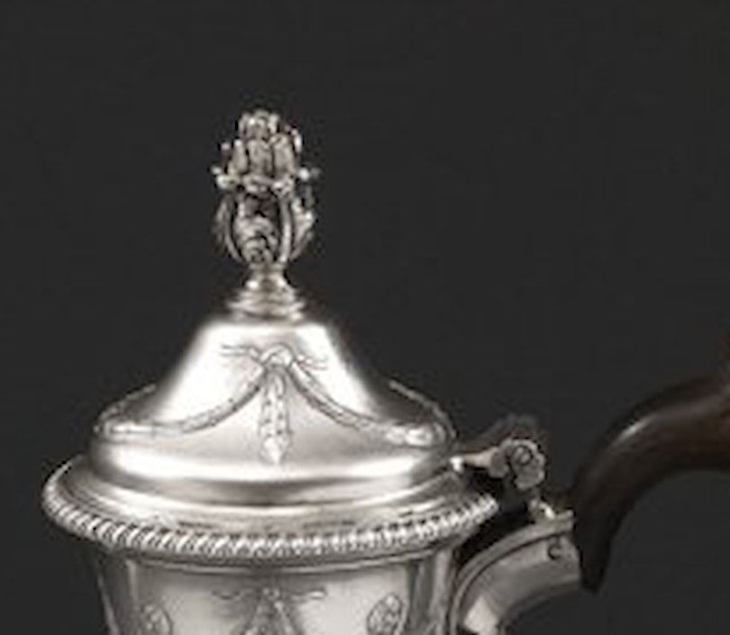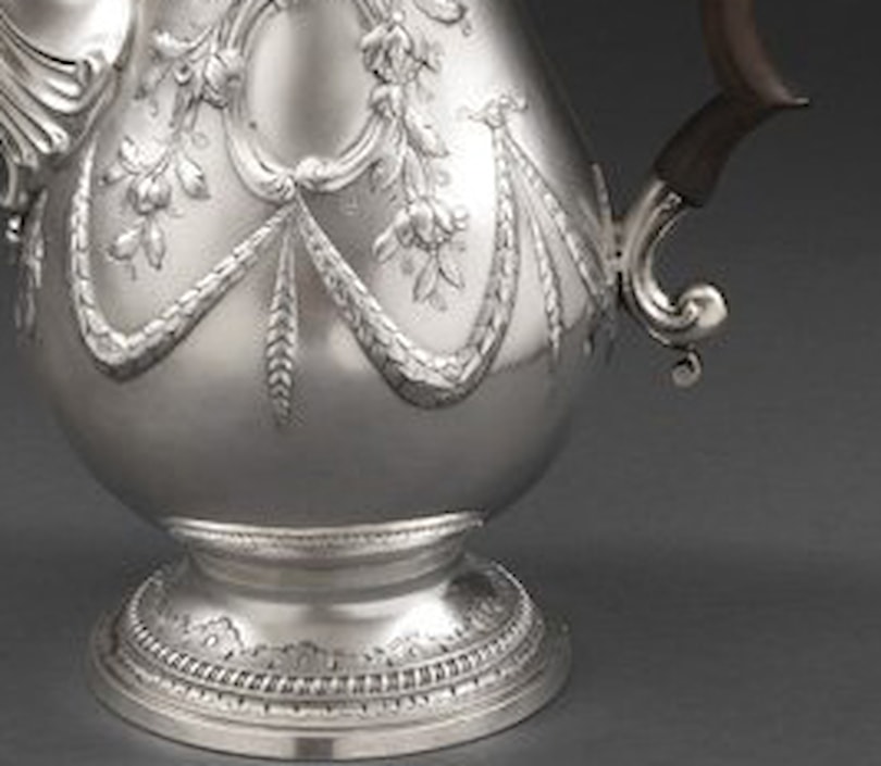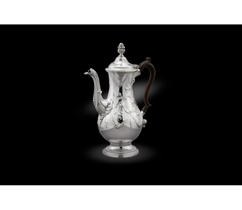 Of baluster form on circular foot, chased and embossed with husk garlands and floral sprays, with foliate finial, beaded spout and double scroll fruitwood handle.
