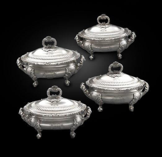 Each oval, on four acanthus and scroll feet, with two acanthus-clad handles, the border gadrooned with foliage and shells at intervals, the domed cover with gadrooning, and an acanthus-clad ring finial, each engraved with a coat-of-arms on body and a crest on cover, marked under base, cover bezel, and finial.