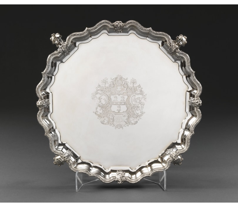William CLEAVE, Alderman of London, died 1667, CLEVE or CLIVE, London. Arms: Argent, on a fess between three wolves’ heads erased sable, as many mullets or. (Reference: Papworth’s Ordinary of British Armorials page 826 & Burke’s General Armory, page 205.) Shaped circular, the double ogee border applied with eight masks at intervals, the border with a rim of flowerheads and bead-and-reel, on four openwork scroll legs with shell feet, field finely engraved with a coat-of-arms within an elaborate cartouche with figures of a shepherd and shepherdess, herms, putti, grapevine and flowers. With scratchweight ‘106..15’.
