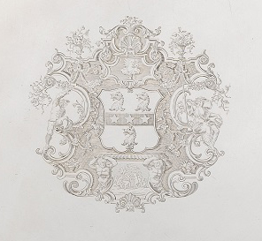 An identical cartouche, attributed by Charles Oman to Joseph Sympson, appears on a salver of 1733, maker's mark of Thomas Farren, in the Victoria & Albert Museum, illustrated in English Engraved Silver, 1150-1900, 1978, p. 90, fig. 103. A small number of objects survive with engraving signed by Sympson, much of it in vastly differing style, suggesting that he ran one of the most successful engraving workshops in London during this period. An "S. Sympson" (probably Joseph's son or nephew) published A New Book of Cyphers, More Compleat & Regular than ever Publish'd in 1726 (see Christopher Hartop, "Engraving on English Silver", Antiques, February, 1997, p. 343).