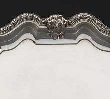 William CLEAVE, Alderman of London, died 1667, CLEVE or CLIVE, London. Arms: Argent, on a fess between three wolves’ heads erased sable, as many mullets or. (Reference: Papworth’s Ordinary of British Armorials page 826 & Burke’s General Armory, page 205.) Shaped circular, the double ogee border applied with eight masks at intervals, the border with a rim of flowerheads and bead-and-reel, on four openwork scroll legs with shell feet, field finely engraved with a coat-of-arms within an elaborate cartouche with figures of a shepherd and shepherdess, herms, putti, grapevine and flowers. With scratchweight ‘106..15’.