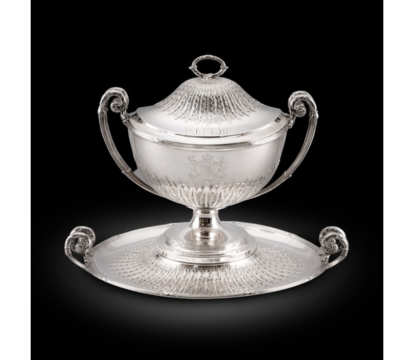 This soup tureen on stand was made for the 2nd Earl of Camden (1759-1840) in 1794. It formed part of an extensive silver dinner service made by Storr and was almost certainly used for the 2nd Earls tenure as Lord Lieutenant of Ireland from 1795-1798. This commission represents the first highly important service that Storr produced and it was arguably from this that he was to get much of his subsequent patronage. Pratt went on to become Secretary of State for War and the Colonies from 1804-1805, and Lord President of the Council, 1807-1812. He became a Knight of the Garter in 1799 and was created Marquess Camden in 1812.