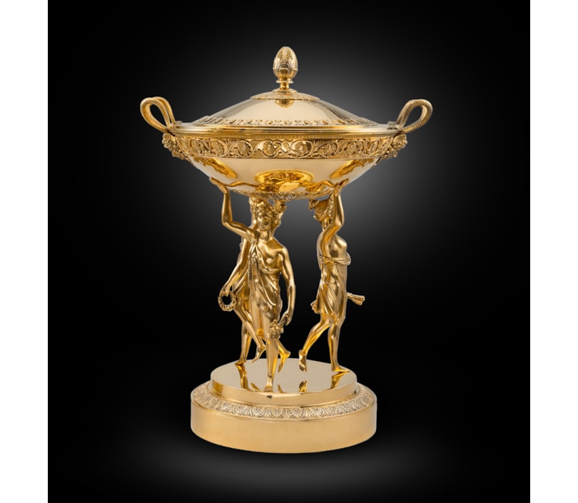 After a design, circa 1817, of A.-L.-M. Cavelier, for Jean-Baptiste-Claude Odiot. The circular base cast and chased with a band of stylised foliage on a matted ground, the hemispherical bowl supported on cast figures of Ceres, Bacchus and Fame, the bowl applied with a band of trailing vines, dolphins and bulrushes, with Bacchic female mask and double serpent handles, the domed cover with foliage and bud finial, with plain liner with shell grips, marked on base, figures, bowl cover, finial and applied ornament on cover, the base stamped 'Odiot a Paris', further stamped '10212' underneath, with metal plate underneath. This sumptuous tureen was first manufactured in 1817, as part of a set of 219 pieces comissionned by Count Demidoff. The original pièce is presently exhibited at the Louvre museum.