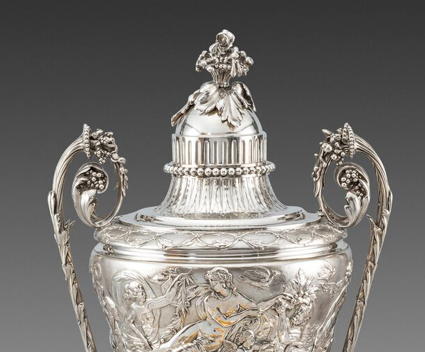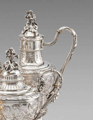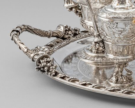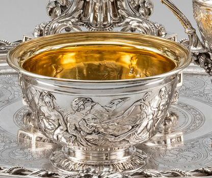 Comprising of a tea urn, coffee pot, teapot, covered sugar bowl, cream jug and waste bowl. Each piece with a cast and applied band of a fantastical scene of Poseidon, Amphitrite, and their children abreast of dolphins. The looping handles terminating in cornucopia. The finials formed as a floral spray. Hallmarked to the underside of each piece and to the covers. The interiors of the waste bowl, sugar and cream with original gilding. The tray with a beaded and acanthus border again with looping handles terminating with cornucopia. The flat surface chased and engraved with vitruvian scrolls. The centre with a monogram.