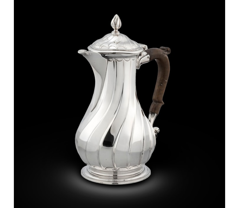 The body decorated with swirling fluting tapering to bat wing edges. The lid topped with writhian finial and decorated with swirling fluting. A double scroll fruitwood handle, the ends mounted with holly leaf collars.