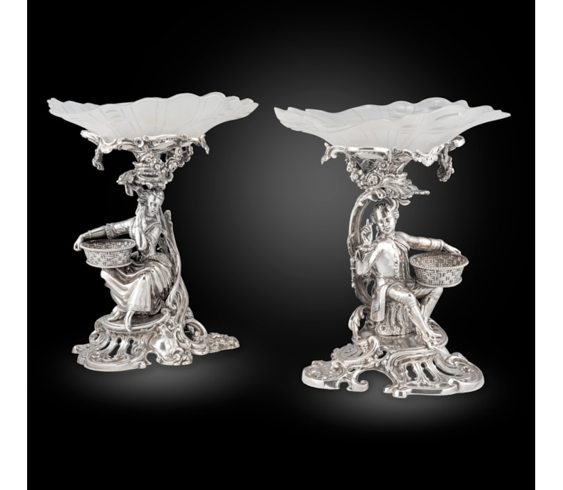 Each on cast and openwork foot, the stem of one applied with a cast figure of a lady and the other a gentleman, each holding a basket, one with glass liner with flower swag applied support for the part-frosted glass dish.