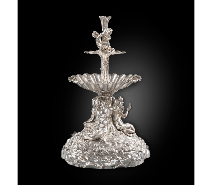 On domed oval base, cast and chased as rockwork and with shells, supporting three cast mermaids surrounding a branch cast stem and below a central flute bowl, with a further branch-cast stem with a finial cast as two putto. Formed as three mermaids on a rocky shell-strewed outcrop surmounted by woody stem and putti below a cornucopia.