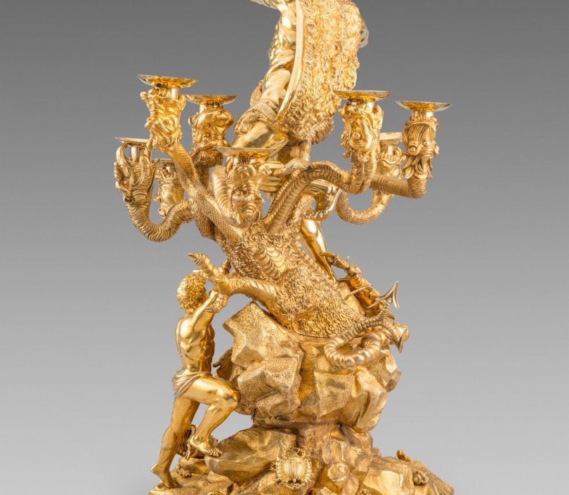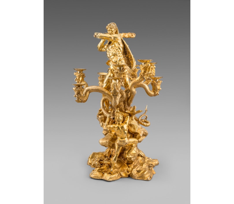 Modelled as the second labour of Hercules in which he slays the Lernean Hydra, the base cast and chased as a rock outcrop which supports the Hydra, the base applied with foliage and creatures among which rests one of the severed heads of the Hydra and further supporting a cast figure of Iolaus who is holding a dagger to one of the necks of the Hydra, all surmounted by Hercules, draped in a lion's pelt and loin cloth, wielding a club, the monster's nine heads arranged asymmetrically and forming the candle sockets, each with a plain nozzle, a large crab clings to Hercules's right ankle, marked on Hercules' pelt, loin cloth, club, nozzles, Hydra, crab, Iolaus, base and many of the detachable elements on the base.