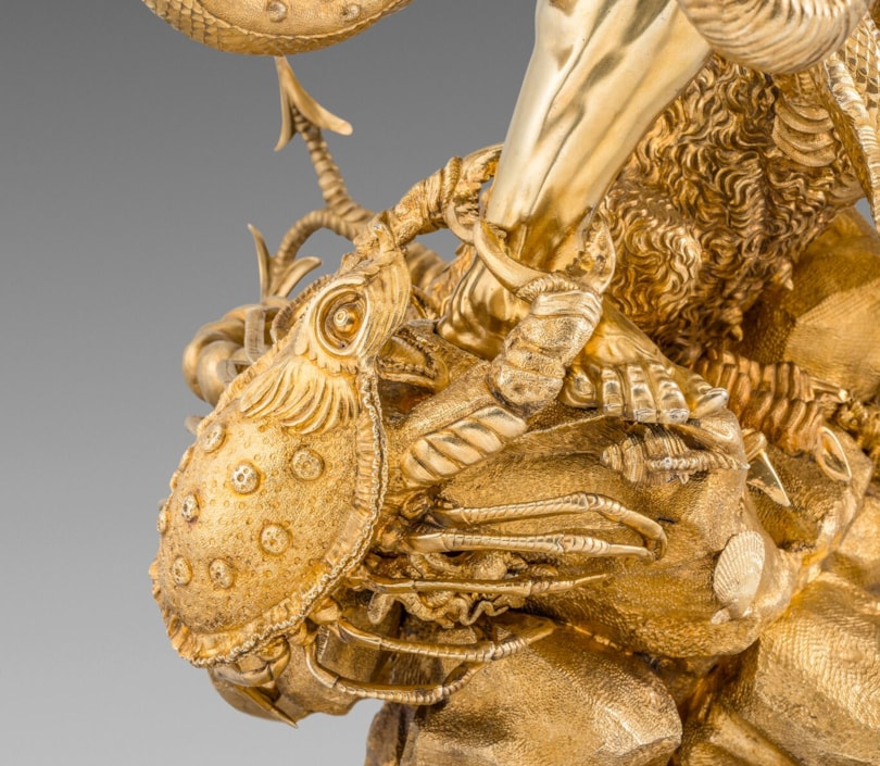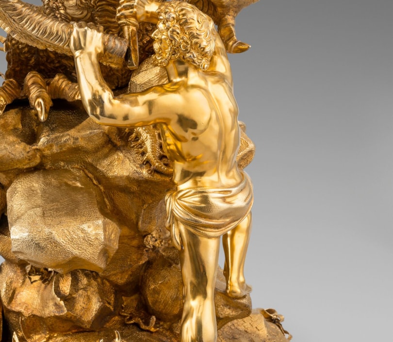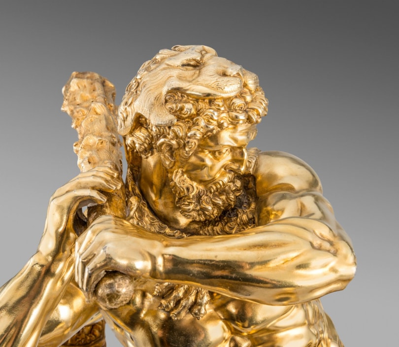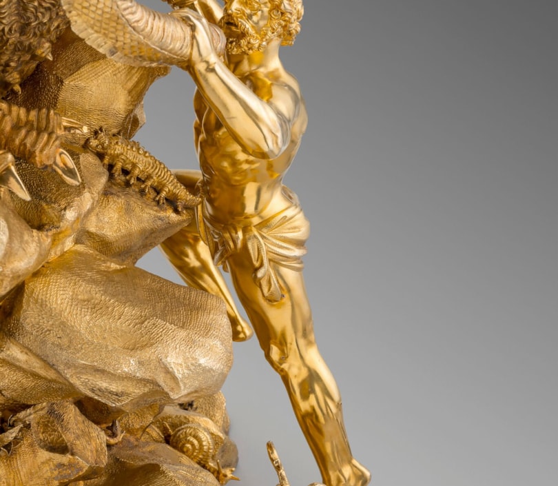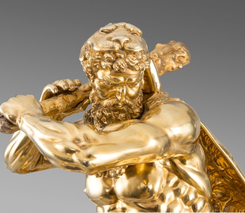 The choice of subject may have been influenced by allegory, but Hercules Slaying the Hydra was an influential subject for silversmiths from the 16th and 17th centuries. The subject was popularised by renowned sculptor Adriaen de Vries (1556-1626) in his design for one of two fountains for the city of Augsburg. Craftsmen and goldsmiths from courts across Europe were dispatched to Augsburg to see his masterpieces. Prints after de Vries’s works were later published by Jan Muller. A figure by silversmith Philipp Kusel, Augsburg, c. 1690 sold, From Roentgen to Faberge: A European Private Collection; Christie’s, London, 20 May 2015, lot 25. Another by Albecht Biller, Augsburg, 1700, is in the Maximilianmuseum, Augsburg.