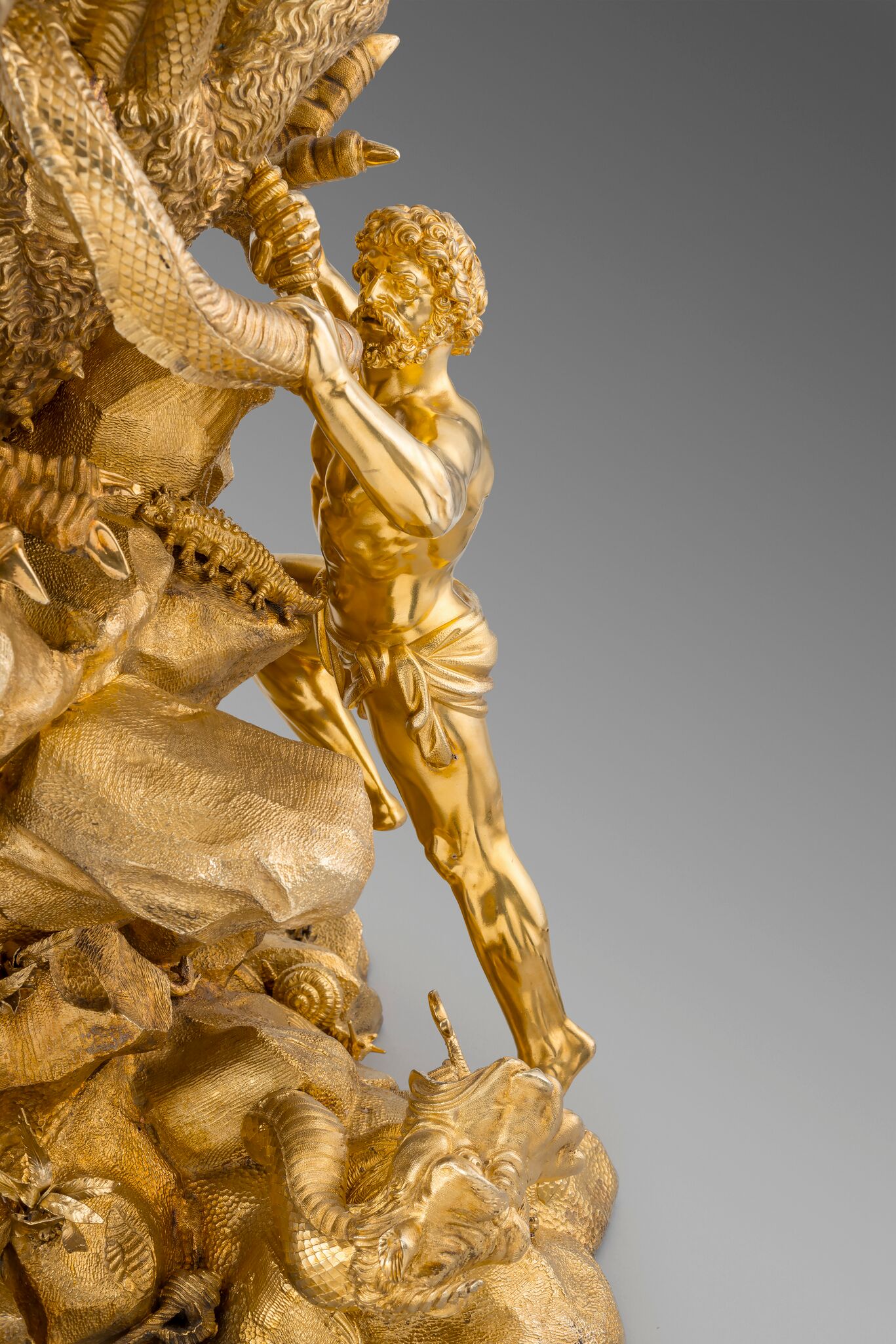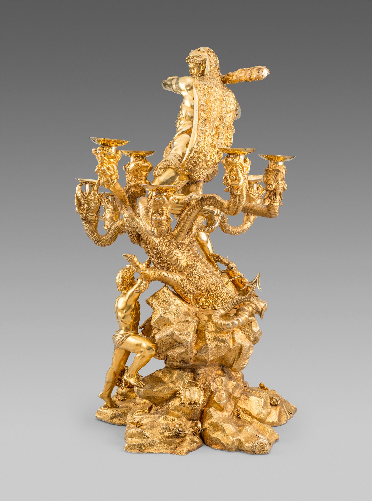 Modelled as the second labour of Hercules in which he slays the Lernean Hydra, the base cast and chased as a rock outcrop which supports the Hydra, the base applied with foliage and creatures among which rests one of the severed heads of the Hydra and further supporting a cast figure of Iolaus who is holding a dagger to one of the necks of the Hydra, all surmounted by Hercules, draped in a lion's pelt and loin cloth, wielding a club, the monster's nine heads arranged asymmetrically and forming the candle sockets, each with a plain nozzle, a large crab clings to Hercules's right ankle, marked on Hercules' pelt, loin cloth, club, nozzles, Hydra, crab, Iolaus, base and many of the detachable elements on the base.