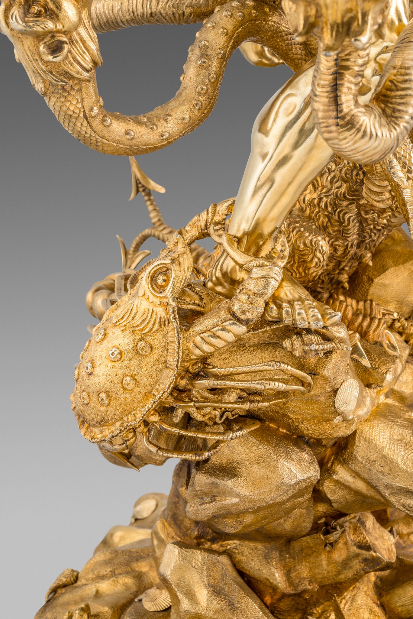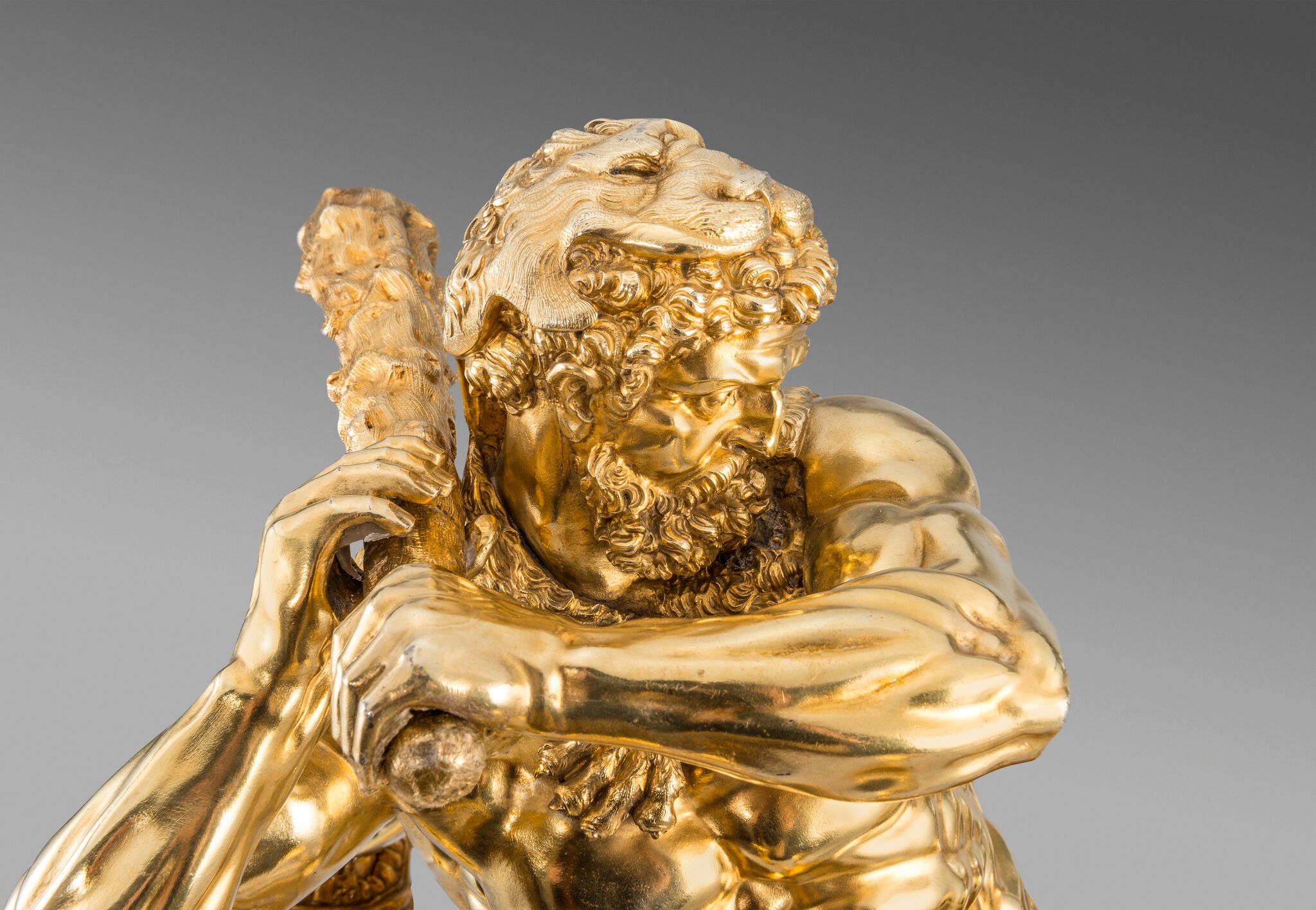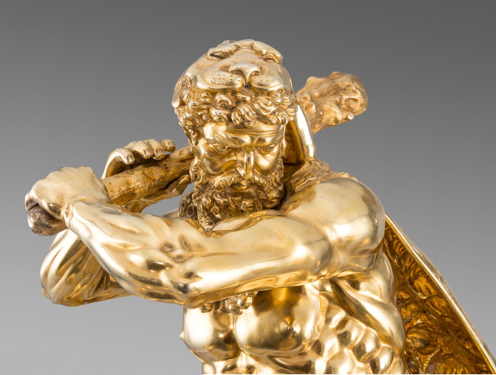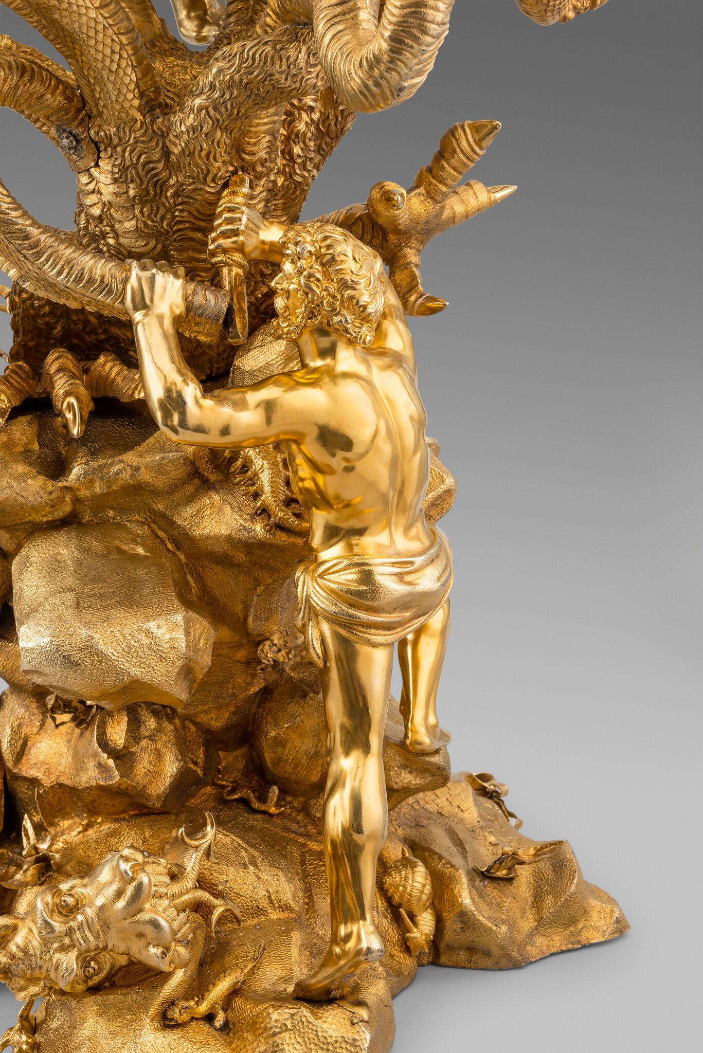 The choice of subject may have been influenced by allegory, but Hercules Slaying the Hydra was an influential subject for silversmiths from the 16th and 17th centuries. The subject was popularised by renowned sculptor Adriaen de Vries (1556-1626) in his design for one of two fountains for the city of Augsburg. Craftsmen and goldsmiths from courts across Europe were dispatched to Augsburg to see his masterpieces. Prints after de Vries’s works were later published by Jan Muller. A figure by silversmith Philipp Kusel, Augsburg, c. 1690 sold, From Roentgen to Faberge: A European Private Collection; Christie’s, London, 20 May 2015, lot 25. Another by Albecht Biller, Augsburg, 1700, is in the Maximilianmuseum, Augsburg.