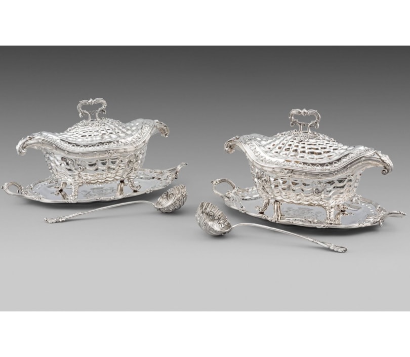 Each tureen of oval shape and on four quilted scroll feet, with beaded ribbon-tied reeded borders interspersed with acanthus. The tureens chased overall with a wave and scroll pattern with foliage-capped scroll handles. The conforming cover quilted and with beaded scroll and guilloche border together with beaded foliate scroll handle. The plain liner with scroll handles and strengthening panels, the stands each shaped oval with beaded foliage wrapped reeded border and two handles, with inner beaded border. The ladles each with shell bowl, scroll and shell heel, reeded stem and foliage-wrapped terminal, the stands engraved with a coat-of-arms, the ladles engraved with a crest.