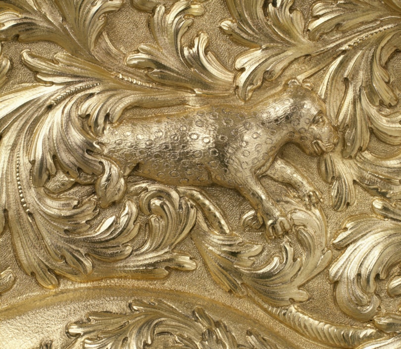 Natalie Siselina (English Silver Treasures from the Kremlin, 1991, p. 130) describes the vigorous floral decoration that originated in Holland during the 1650s which this dish and Kremlin plate have in common: "Fashionable silver began to be embossed with ornamentation of a naturalistic character consisting of outsized flowers (most often double tulips and poppies and foliage. Tightly packed decoration could not have corresponded better to the English love for covering a surface with ornamental motifs. The new approach to ornamentation had a telling effect not only in the change to a larger scale but also in the reinforcement of its own characteristic element. The entire surfaces of the Charles ll articles are filled with the same pattern that almost smothers their form ...Peculiar to English silversmiths is the depiction of animals alongside the plants...".