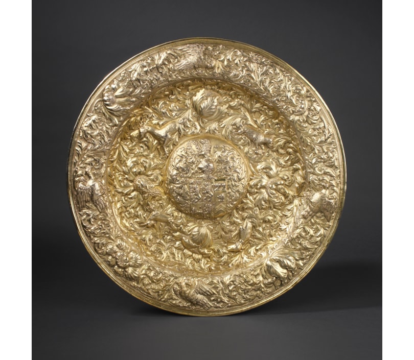 The circular dish is embossed and chased in high relief with scrolling acanthus foliage, flower heads and tulips interspersed with birds and animals. The centre has a raised boss chased with a coat of arms, helm and crest surrounded by foliate mantling. The arms and crest are those of Jeffreys for Sir George Jeffreys.