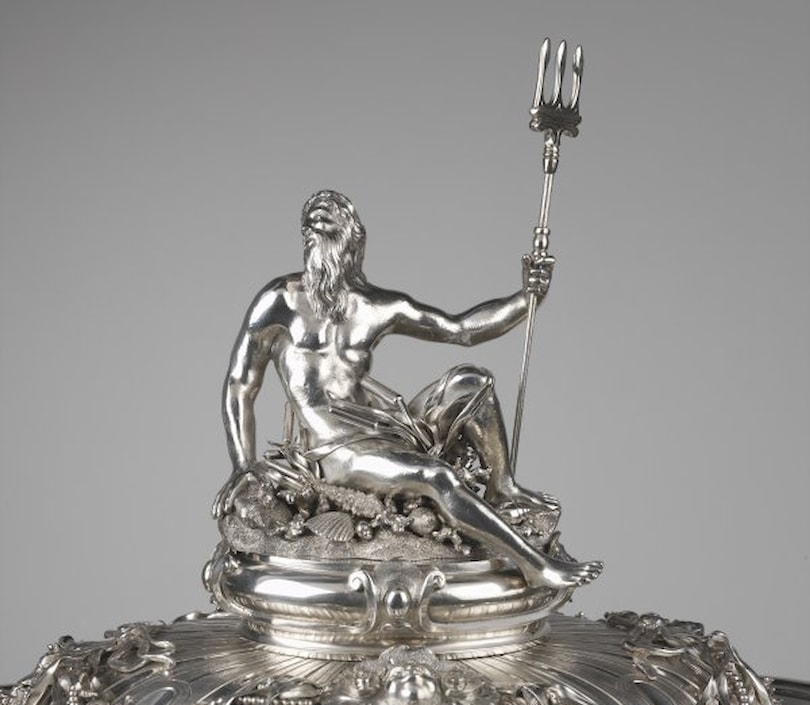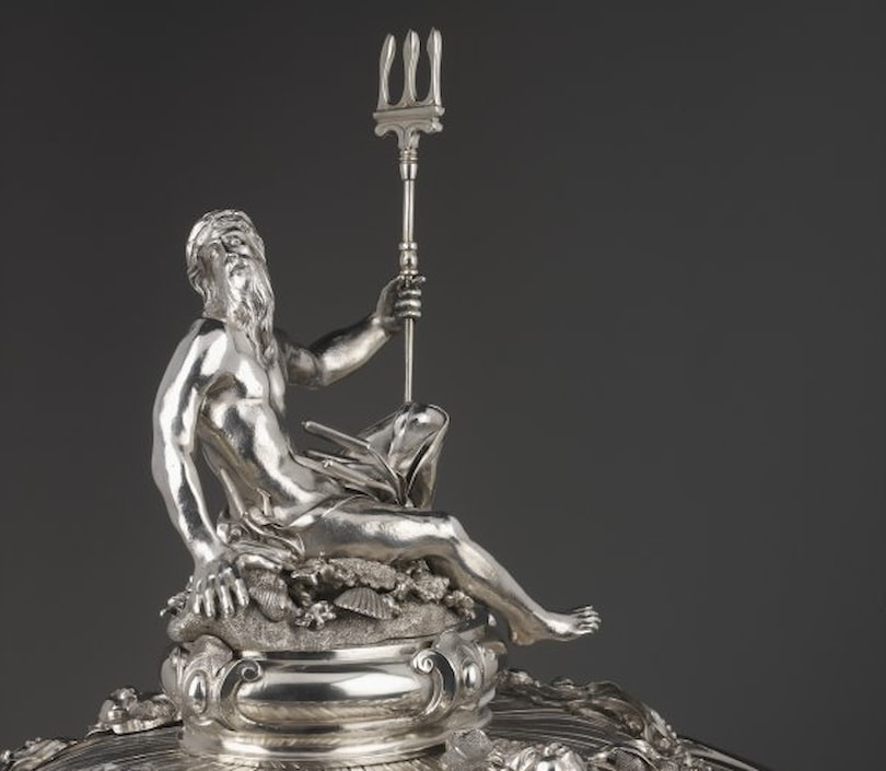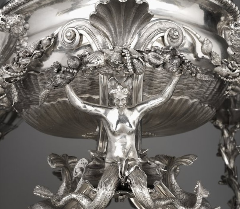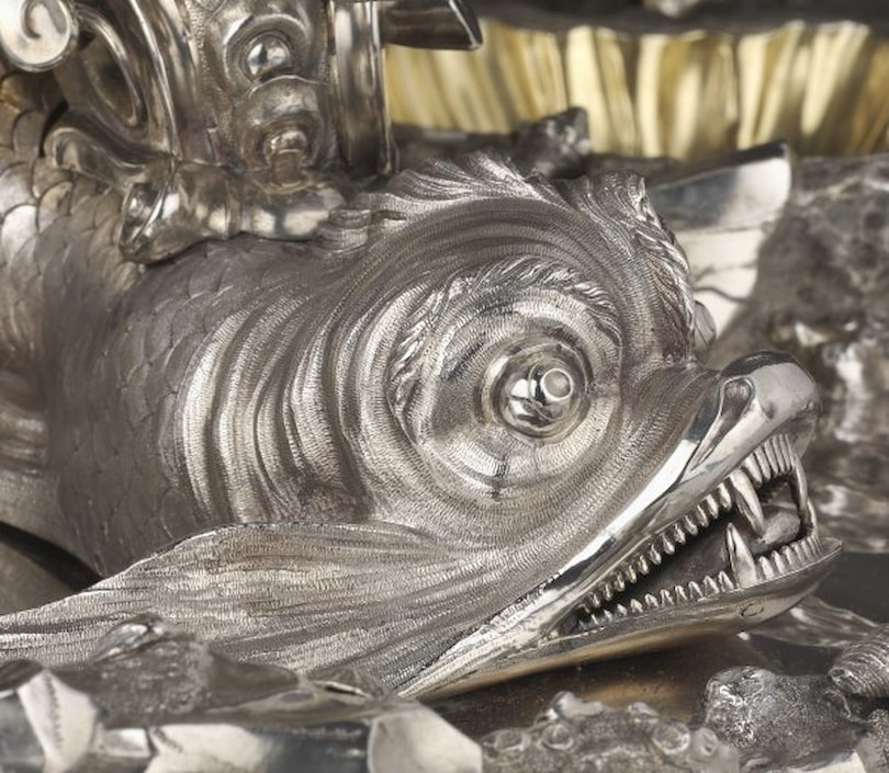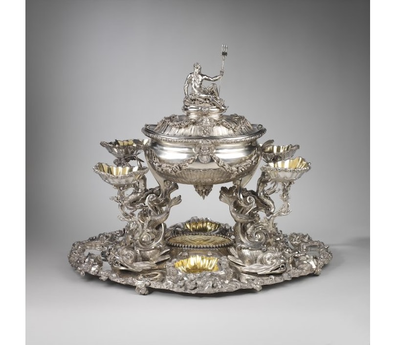 The centrepiece comprises a large, oval central tureen the underside of which is applied with a shell, with a pendant drop to the underside formed of small shells, the sides of the tureen are applied with swags of shells and pearls contained in nets suspended from masks, with a guilloche border. The domed cover has alternating matted and burnished flutes and is applied with further swags of shells, its finial is a reclining figure of Neptune resting on shells. The tureen is supported on four scrolls legs entwined with dolphins, from each of whose heads springs a naturalistically modelled branch entwined with seaweed and shells and terminating in a shell-shaped bowl supported by the arms of a triton. All resting on plateau cast and chased with shells, rocks and sea spray and modelled with two further shell-shaped bowls, on shell feet. The centre of the plateau is applied with a coat of arms and motto within a beaded border.
