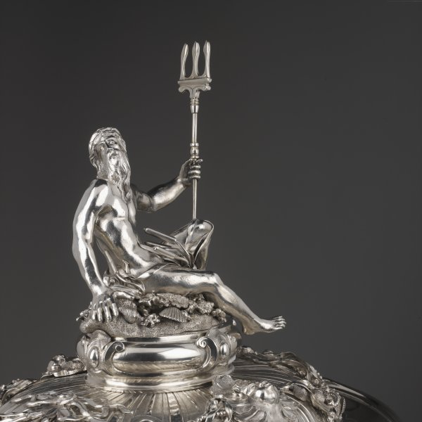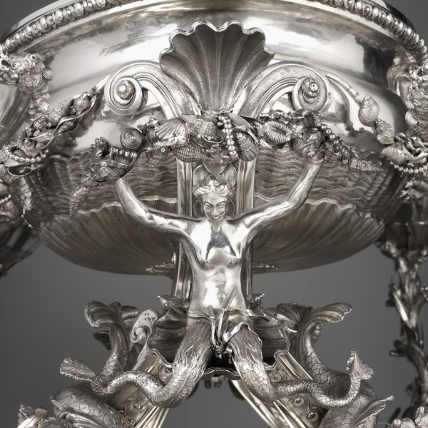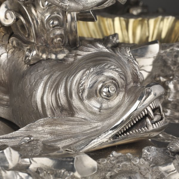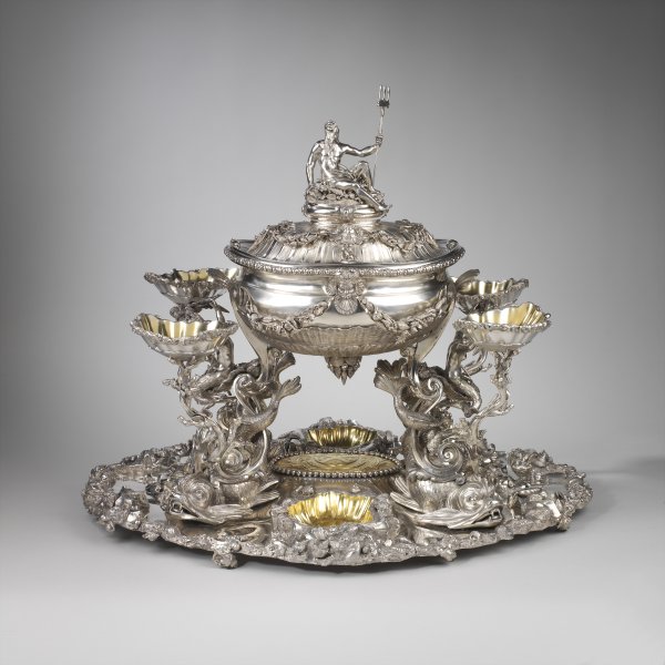 The centrepiece comprises a large, oval central tureen the underside of which is applied with a shell, with a pendant drop to the underside formed of small shells, the sides of the tureen are applied with swags of shells and pearls contained in nets suspended from masks, with a guilloche border. The domed cover has alternating matted and burnished flutes and is applied with further swags of shells, its finial is a reclining figure of Neptune resting on shells. The tureen is supported on four scrolls legs entwined with dolphins, from each of whose heads springs a naturalistically modelled branch entwined with seaweed and shells and terminating in a shell-shaped bowl supported by the arms of a triton. All resting on plateau cast and chased with shells, rocks and sea spray and modelled with two further shell-shaped bowls, on shell feet. The centre of the plateau is applied with a coat of arms and motto within a beaded border.