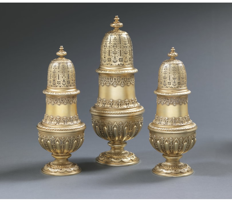 Each vase-shaped, on spreading circular foot with foliate swags on a matted ground, the body with applied strapwork on a matted ground, the cover pierced with flowers, shells, and vases, with foliage baluster finial, marked under base with maker's mark, one struck twice, the foot rim of each further numbered and engraved with ownership initials and Cyrillic scratchweight 'No 159 Gr:D:Sh: 2 f[unt] 53 zol[otniks]', 'No 65 Gr:D:Sh 1 f[unt] 54 zol[otniks] and No 65 Gr:D:Sh 1 f[unt] 49