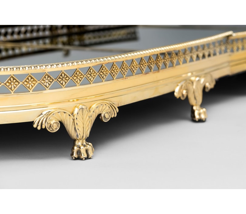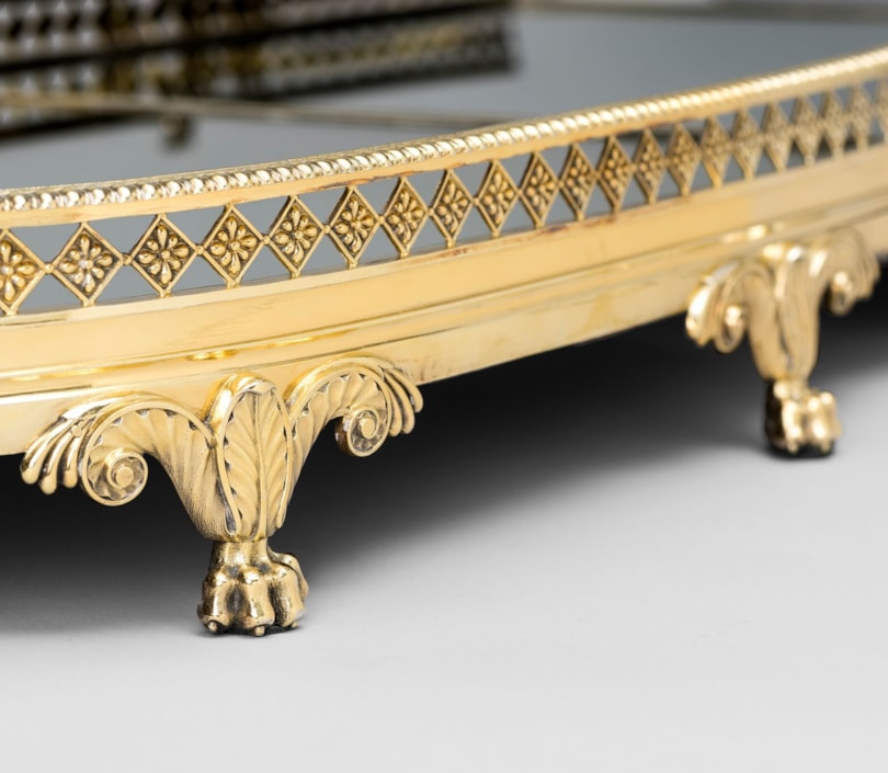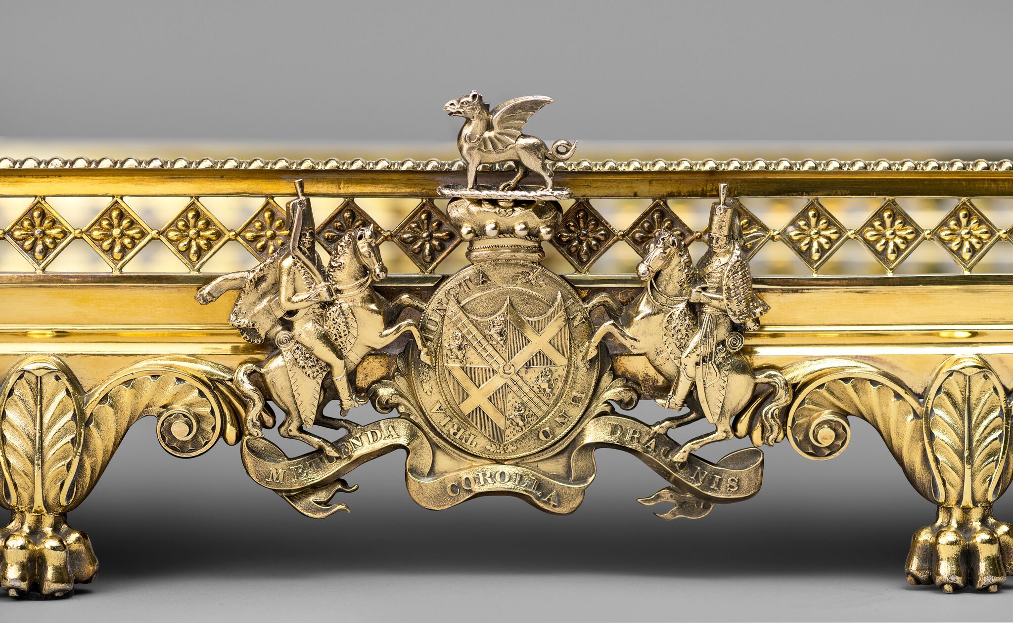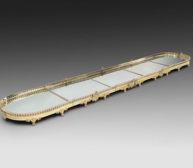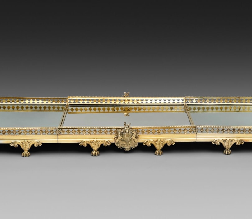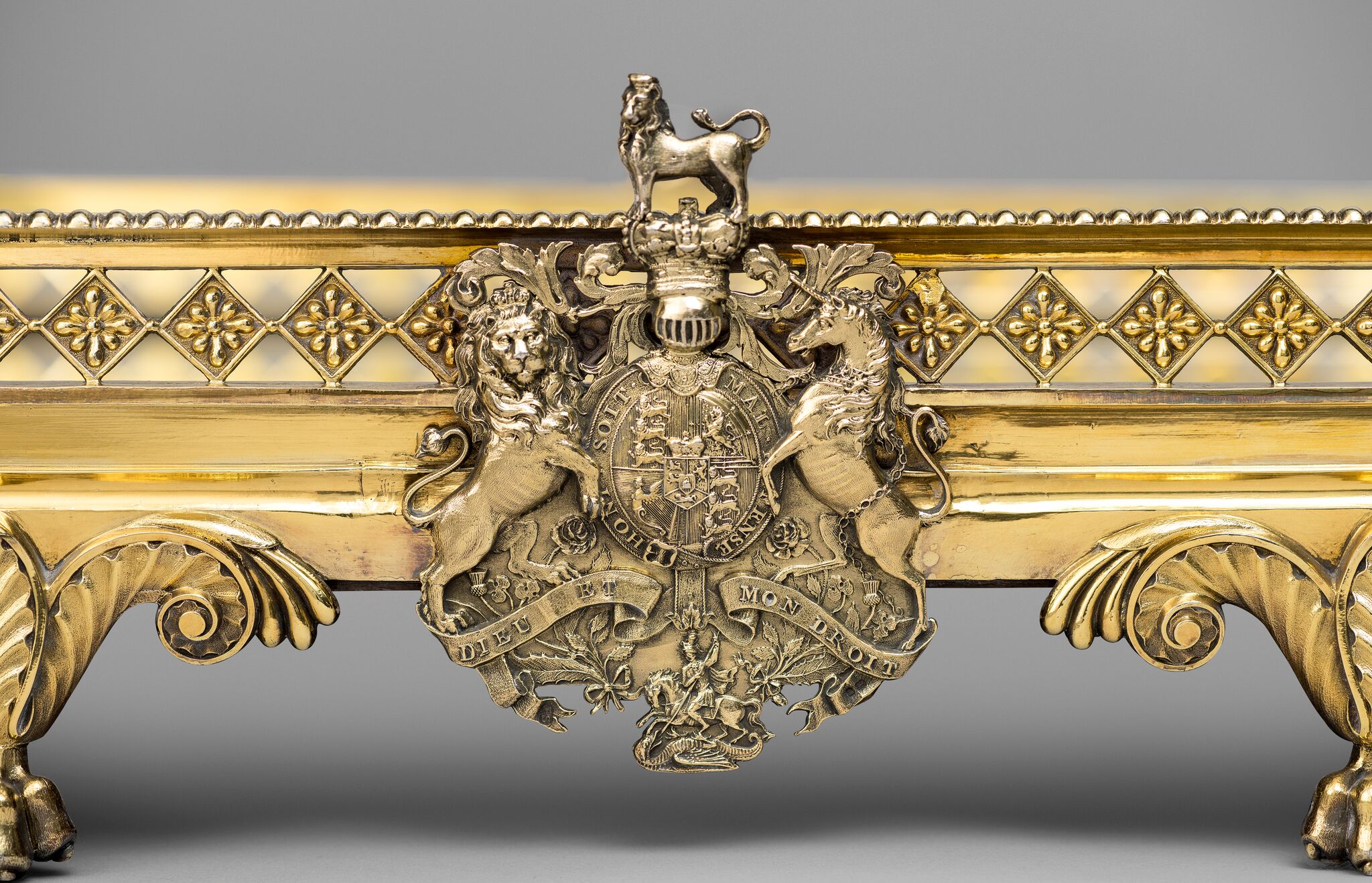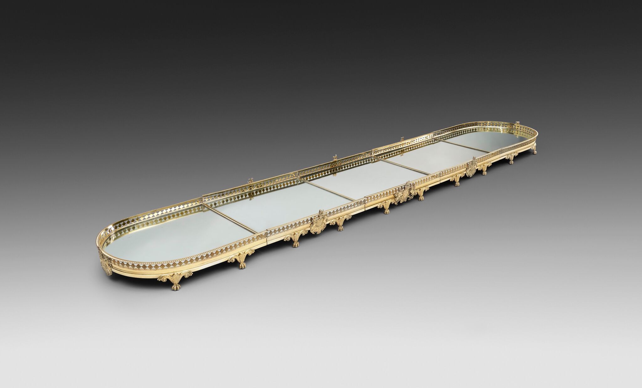 The oblong plateau with curved ends and in five sections. Each inset with a mirror and on four lion's paw feet with palmette, scroll and anthemion decoration. The sections decorated with cast and pierced lozenge and rosette sides and with gadrooned rim, the sides alternately applied with the Royal arms and a coat-of-arms with Baron's coronet above.