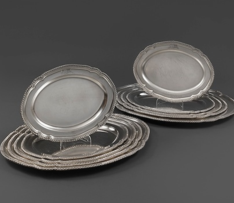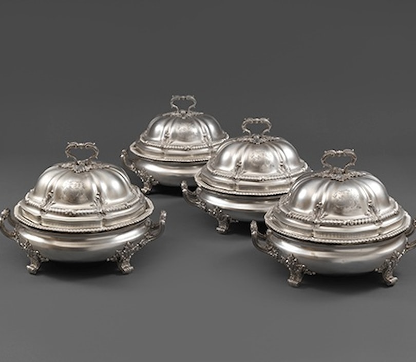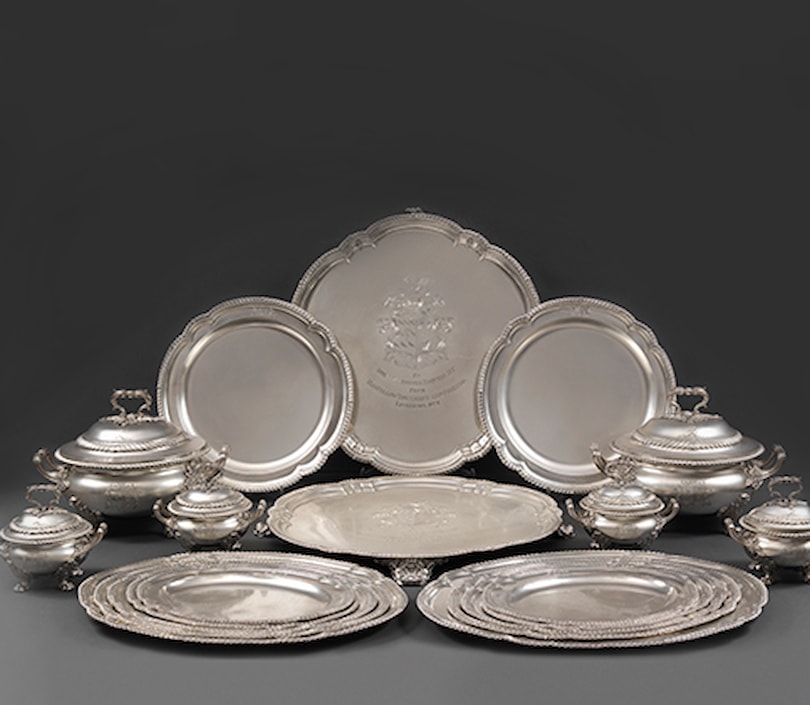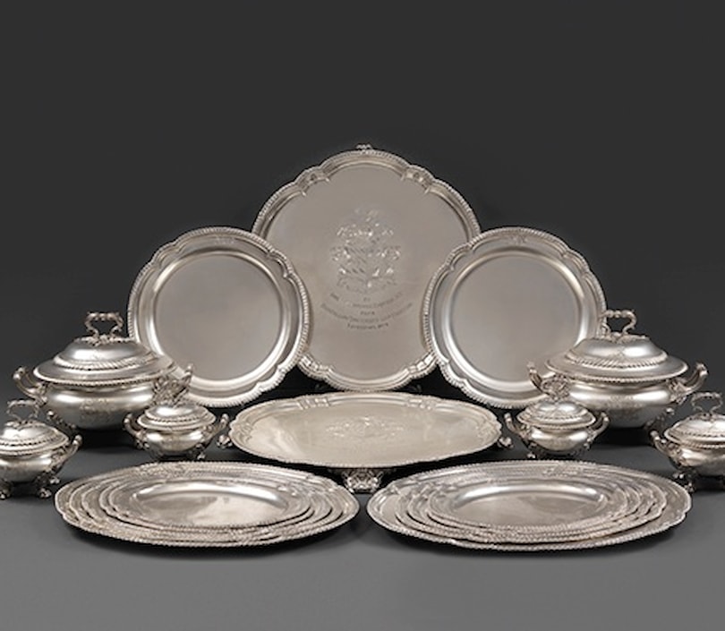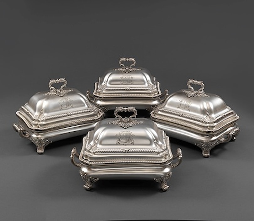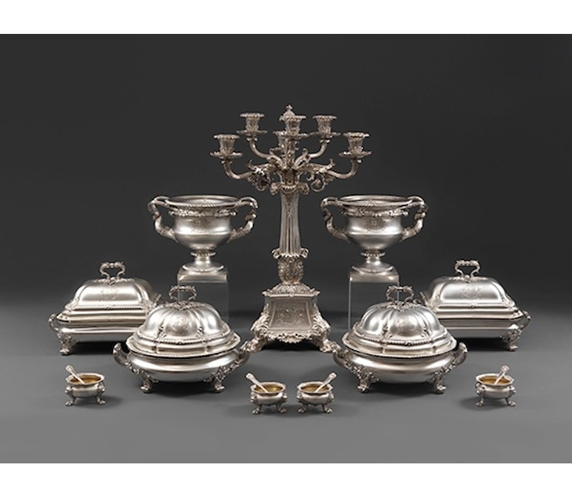 Complete dinner services from any period in English silver are extremely rare, and with the exception of the one made for the Earl of Egremont of Petworth and another made for the Duke of Norfolk, this is the only service by Storr to survive more or less complete.