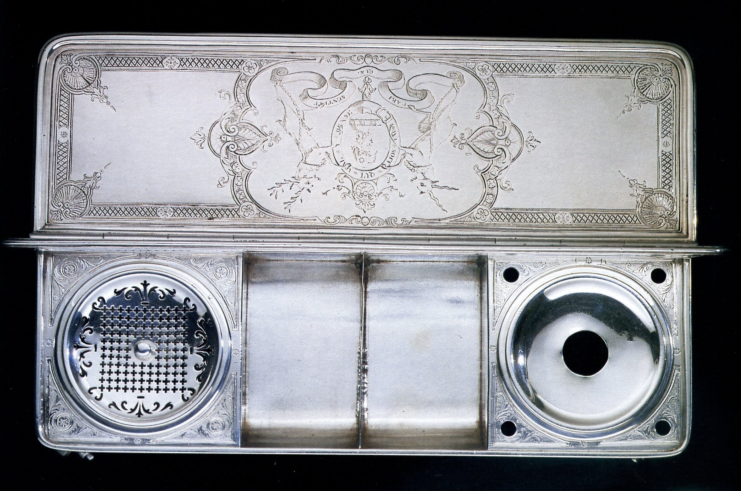 Of rounded rectangular form, raised on four shell-headed scroll supports, centrally hinged flat covers finely engraved with ‘Hogarthian’ borders, strapwork and shells, enclosing on one cover arms and supporters and on the other crest, motto and supporters of Sir Robert Walpole, the interior fitted with a removable covered inkwell and a sander, the latter pierced with diaper and formal foliage and both held in frames engraved with foliage and flowerheads on matted grounds.