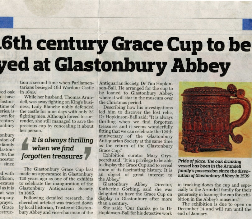 At that time it is noted that 'This peg tankard is one of the very few articles which were saved from Wardour castle, by Blanch, lady Arundell, who nobly defended that edifice against sir Edward Hungerford, and colonel Stode, in the absence of her husband, who had raised a regiment of horse, and joined Charles I., at Oxford. In one of the old inventories of the effects belonging to Wardour castle, this cup is mentioned as having been brought from the ancient abbey of Glastonbury, and was so much valued by the lady Arundell, that, upon surrendering the castle, she withdrew this cup, and certain articles of her property, and retiring to Winchester, retained it as long as she lived., (W. Hone, The Year Book of Daily Recreation and Information: Concerning Remarkable Men, Manners, Times, Seasons, Solemnities, Merry-makings, Antiquities & Novelties, Forming a Complete History of the Year; & a Perpetual Key to the Almanac, London, 1832, p. 241-242).