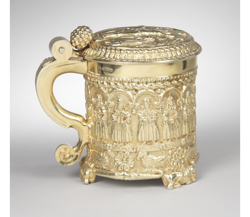 This extraordinary tankard is a cast of the so called 'Glastonbury Cup' from the collection of Lord Arundell of Wardour Castle. The exact history of when the cup entered the Arundell family is unclear. It has traditionally been suggested to have been taken from Glastonbury Abbey, in Somerset, presumably when Glastonbury was stripped of it's valuables in September 1539, following the dissolution of the monasteries by Henry VIII, though the earliest record of it being with the family is during the English Civil war.