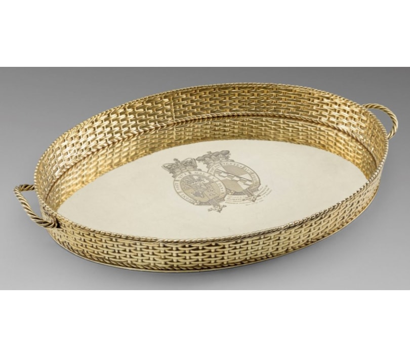 Of oval outline, with basket weave pattern sides, rope twist handles and rim, engraved to the centre with coats-of-arms each within a garter and below a coronet.